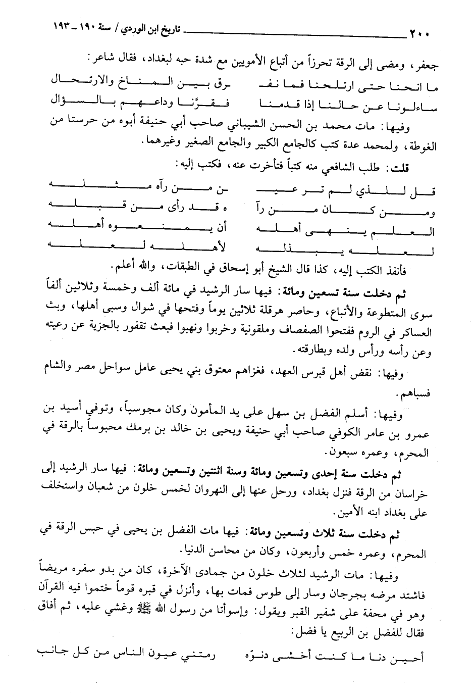 ثمَّ دخلت سنة ثَلَاث وَتِسْعين وَمِائَة: فِيهَا مَاتَ الْفضل بن يحيى فِي حبس الرقة فِي الْمحرم، وعمره خمس وَأَرْبَعُونَ، وَكَانَ من محَاسِن الدُّنْيَا.
