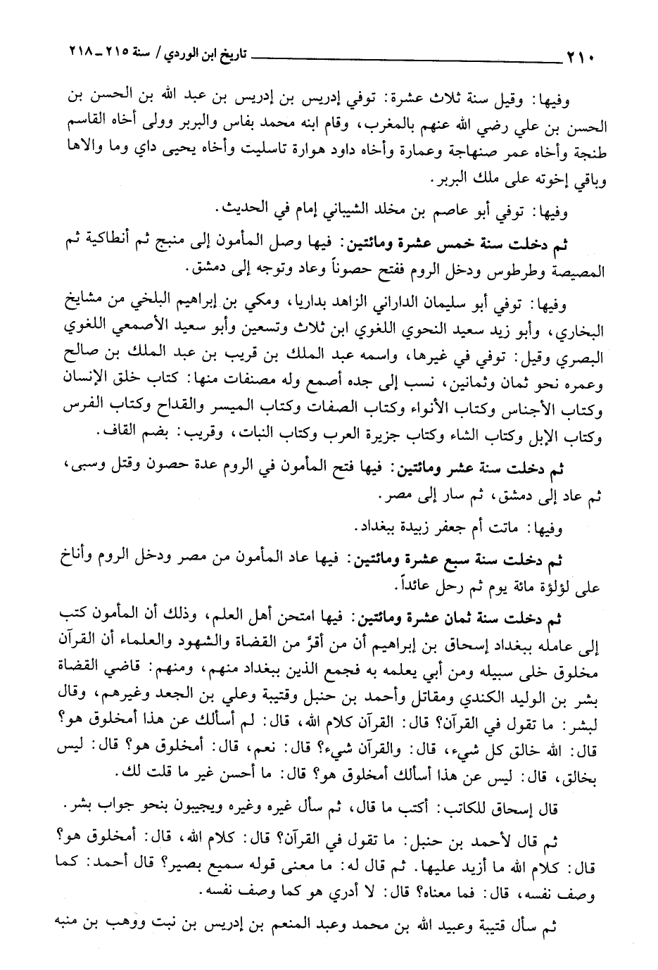 ثمَّ دخلت سنة ثَمَان عشرَة وَمِائَتَيْنِ: فِيهَا امتحن أهل الْعلم، وَذَلِكَ أَن الْمَأْمُون كتب إِلَى عَامله بِبَغْدَاد إِسْحَاق بن إِبْرَاهِيم أَن من أقرّ من الْقُضَاة وَالشُّهُود وَالْعُلَمَاء أَن الْقُرْآن مَخْلُوق خلى سَبيله وَمن أبي يُعلمهُ بِهِ فَجمع الَّذين بِبَغْدَاد مِنْهُم، وَمِنْهُم: قَاضِي الْقُضَاة بشر بن الْوَلِيد الْكِنْدِيّ وَمُقَاتِل وَأحمد بن حَنْبَل وقتيبة وَعلي بن الْجَعْد وَغَيرهم، وَقَالَ لبشر: مَا تَقول فِي الْقُرْآن؟ قَالَ: الْقُرْآن كَلَام اللَّهِ، قَالَ: لم أَسأَلك عَن هَذَا أمخلوق هُوَ؟ قَالَ: اللَّهِ خَالق كل شَيْء، قَالَ: وَالْقُرْآن شَيْء؟ قَالَ: نعم، قَالَ: أمخلوق هُوَ؟ قَالَ: لَيْسَ بخالق، قَالَ: لَيْسَ عَن هَذَا أَسأَلك أمخلوق هُوَ؟ قَالَ: مَا احسن غير مَا قلت لَك.