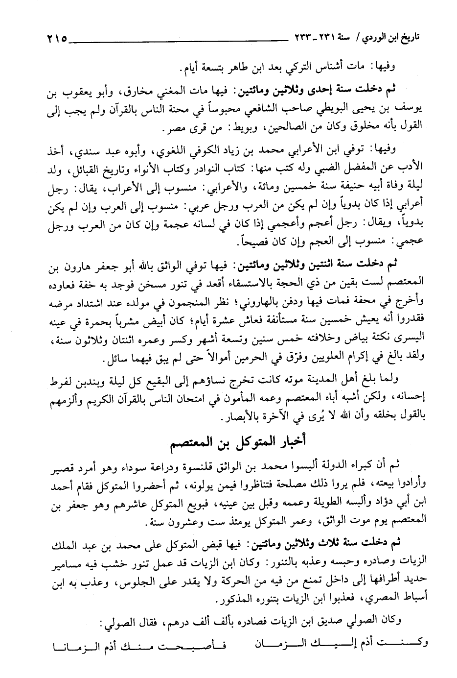 ثمَّ دخلت سنة إِحْدَى وَثَلَاثِينَ وَمِائَتَيْنِ: فِيهَا مَاتَ الْمُغنِي مُخَارق، وَأَبُو يَعْقُوب بن يُوسُف بن يحيى الْبُوَيْطِيّ صَاحب الشَّافِعِي مَحْبُوسًا فِي محنة النَّاس بِالْقُرْآنِ وَلم يجب إِلَى القَوْل بِأَنَّهُ مَخْلُوق وَكَانَ من الصَّالِحين، وبويط: من قرى مصر.