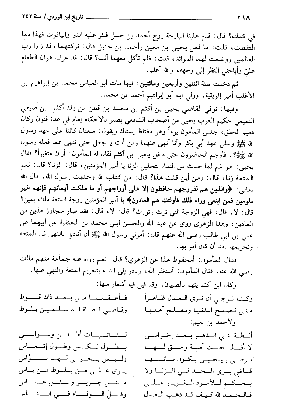 وفيهَا: توفّي القَاضِي يحيى بن أَكْثَم بن مُحَمَّد بن قطن من ولد أَكْثَم بن صَيْفِي التَّمِيمِي حَكِيم الْعَرَب يحيى من أَصْحَاب الشَّافِعِي بَصِير بِالْأَحْكَامِ إِمَام فِي عدَّة فنون وَكَانَ دميم الْخلق، جلس الْمَأْمُون يَوْمًا وَهُوَ مغتاظ يستاك وَيَقُول: متعتان كَانَتَا على عهد رَسُول اللَّهِ - صَلَّى اللَّهُ عَلَيْهِ وَسَلَّم َ - وعَلى عهد أبي بكر وَأَنا أنهى عَنْهُمَا وَمن أَنْت يَا جعل حَتَّى تنْهى عَمَّا فعله رَسُول اللَّهِ - صَلَّى اللَّهُ عَلَيْهِ وَسَلَّم َ -؟ . فأوجم الْحَاضِرُونَ حَتَّى دخل يحيى بن أَكْثَم فَقَالَ لَهُ الْمَأْمُون: أَرَاك متغيرا؟ فَقَالَ يحيى: هُوَ غم لما حدث من النداء بتحليل الزِّنَا يَا أَمِير الْمُؤمنِينَ، قَالَ: الزِّنَا؟ قَالَ: نعم الْمُتْعَة زنا، قَالَ: وَمن أَيْن قلت هَذَا؟ قَالَ: من كتاب اللَّهِ وَحَدِيث رَسُول اللَّهِ، قَالَ اللَّهِ تَعَالَى: {وَالَّذين هم لفروجهم حافظون إِلَّا على أَزوَاجهم أَو ماملكت أَيْمَانهم فَإِنَّهُم غير ملومين فَمن ابْتغى وَرَاء ذَلِك فَأُولَئِك هم العادون} يَا أَمِير الْمُؤمنِينَ زَوْجَة الْمُتْعَة ملك يَمِين؟ قَالَ: لَا، قَالَ: فَهِيَ الزَّوْجَة الَّتِي تَرث وتورث؟ قَالَ: لَا، قَالَ: فقد صَار متجاوز هذَيْن من العادين، وَهَذَا الزُّهْرِيّ روى عَن عبد اللَّهِ وَالْحسن ابْني مُحَمَّد بن الْحَنَفِيَّة عَن أَبِيهِمَا عَن عَليّ بن أبي طَالب رَضِي اللَّهِ عَنْهُم قَالَ: أَمرنِي رَسُول اللَّهِ - صَلَّى اللَّهُ عَلَيْهِ وَسَلَّم َ - أَن أنادي بالنهى فِي الْمُتْعَة وتحريمها بعد أَن كَانَ أَمر بهَا.