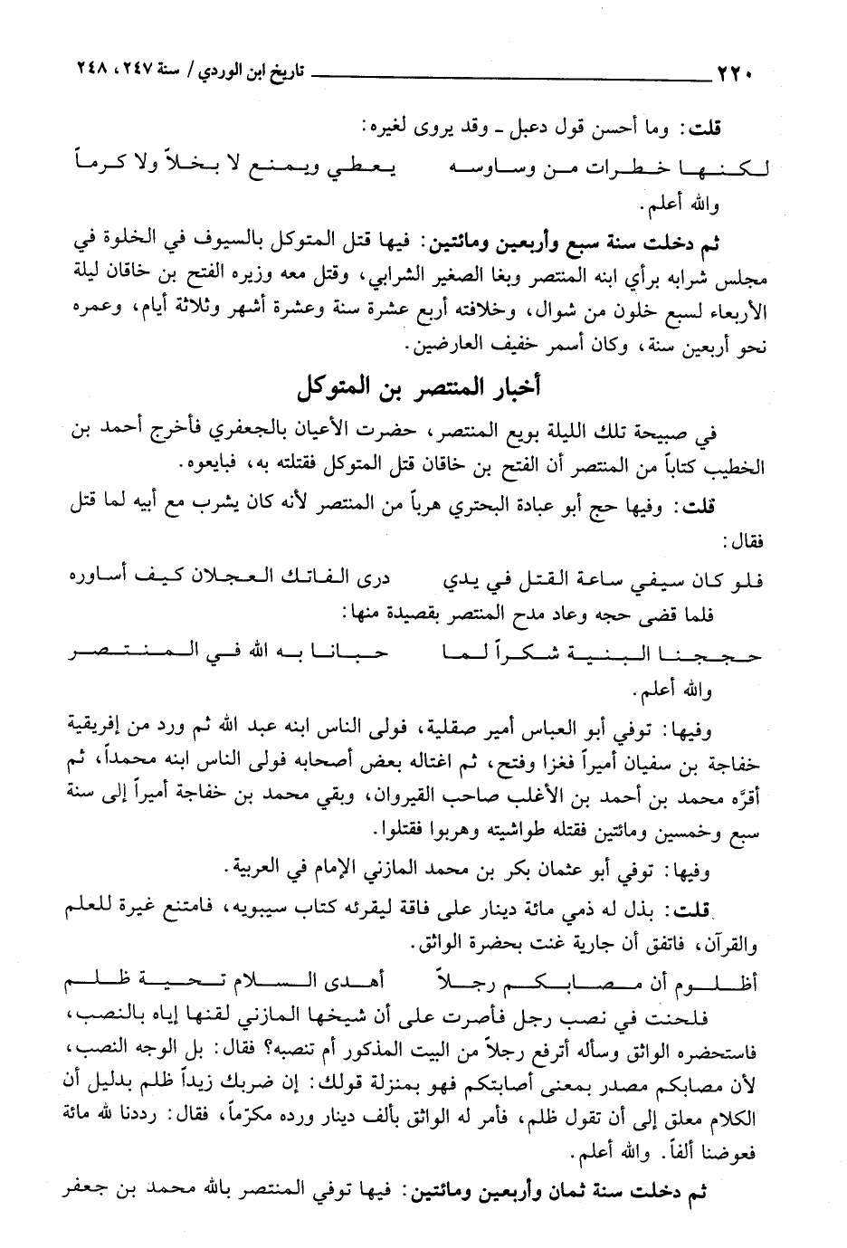ثمَّ دخلت سنة ثَمَان وَأَرْبَعين وَمِائَتَيْنِ: فِيهَا توفّي الْمُنْتَصر بِاللَّه مُحَمَّد بن جَعْفَر