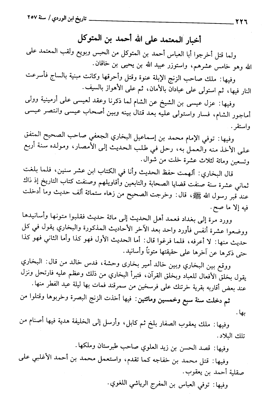 وفيهَا: توفّي الإِمَام مُحَمَّد بن إِسْمَاعِيل البُخَارِيّ الْجعْفِيّ صَاحب الصَّحِيح الْمُتَّفق على الْأَخْذ مِنْهُ وَالْعَمَل بِهِ، رَحل فِي طلب الحَدِيث إِلَى الْأَمْصَار، ومولده سنة أَربع وَتِسْعين وَمِائَة لثلاث عشرَة خلت من شَوَّال.