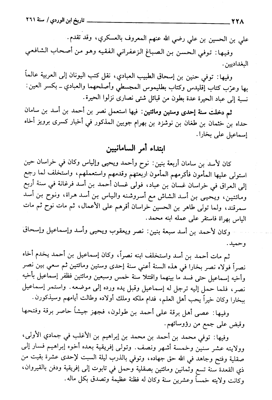وفيهَا: توفّي حنين بن إِسْحَاق الطَّبِيب الْعَبَّادِيّ، نقل كتب اليونان إِلَى الْعَرَبيَّة عَالما بهَا وعرب كتاب إقليدس وَكتاب بطليموس المجسطي وأصلحهما والعبادي - بِكَسْر الْعين: نِسْبَة إِلَى عباد الْحيرَة عدَّة بطُون من قبائل شَتَّى نَصَارَى نزلُوا الْحيرَة.