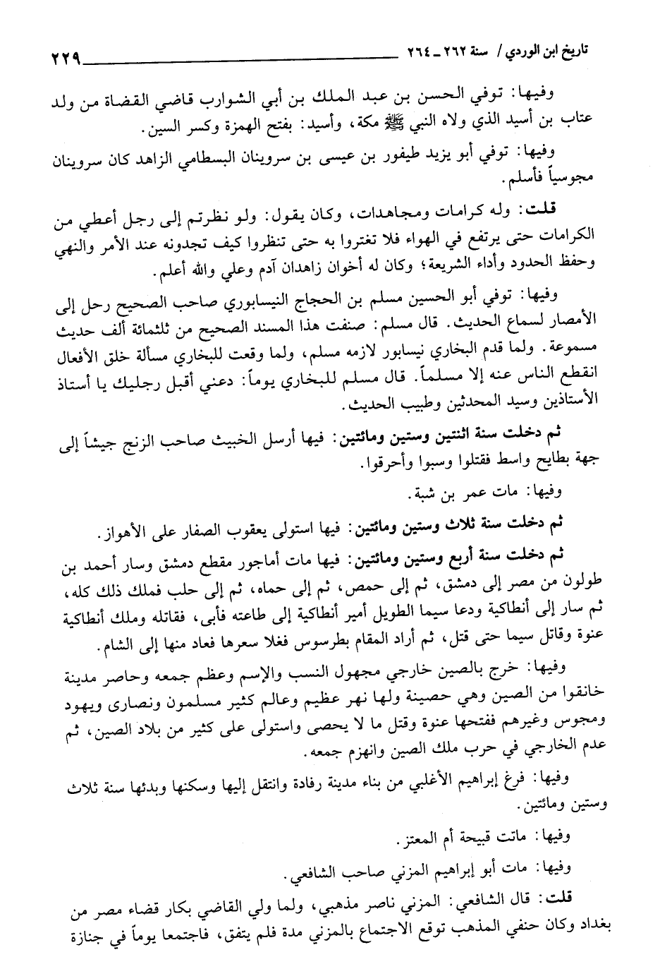 وفيهَا: توفّي أَبُو الْحُسَيْن مُسلم بن الْحجَّاج النَّيْسَابُورِي صَاحب الصَّحِيح رَحل إِلَى الْأَمْصَار لسَمَاع الحَدِيث. قَالَ مُسلم: صنفت هَذَا الْمسند الصَّحِيح من ثلثمِائة ألف حَدِيث مسموعة. وَلما قدم البُخَارِيّ نيسابور لَازمه مُسلم، وَلما وَقعت للْبُخَارِيّ مَسْأَلَة خلق الْأَفْعَال انْقَطع النَّاس عَنهُ إِلَّا مُسلما. قَالَ مُسلم للْبُخَارِيّ يَوْمًا: دَعْنِي أقبل رجليك يَا أستاذ الأستاذين وَسيد الْمُحدثين وطبيب الحَدِيث.