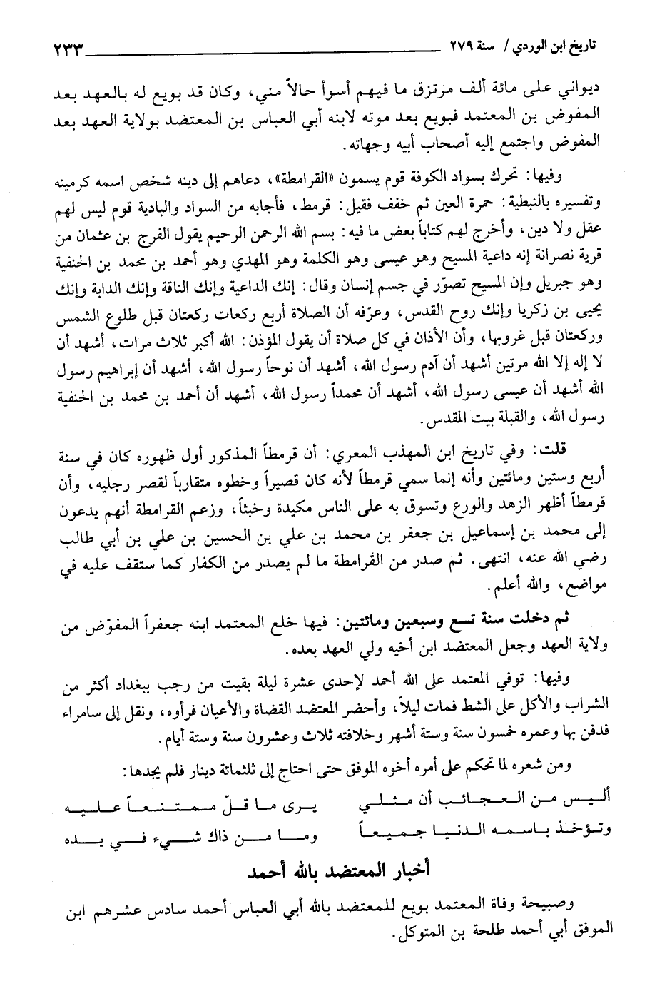 وفيهَا: تحرّك بسواد الْكُوفَة قوم يسمون " القرامطة "، دعاهم إِلَى دينه شخص اسْمه كرمينه وَتَفْسِيره بالنبطية: حمرَة الْعين ثمَّ خفف فَقيل: قرمط، فَأَجَابَهُ من السوَاد والبادية قوم لَيْسَ لَهُم عقل وَلَا دين، وَأخرج لَهُم كتابا بعض مَا فِيهِ: بِسم اللَّهِ الرَّحْمَن الرَّحِيم يَقُول الْفرج بن عُثْمَان من قَرْيَة نصرانة إِنَّه دَاعِيَة الْمَسِيح وَهُوَ عِيسَى وَهُوَ الْكَلِمَة وَهُوَ الْمهْدي وَهُوَ أَحْمد بن مُحَمَّد بن الْحَنَفِيَّة وَهُوَ جِبْرِيل وَإِن الْمَسِيح تصور فِي جسم إِنْسَان وَقَالَ، إِنَّك الداعية وَإنَّك النَّاقة وَإنَّك الدَّابَّة وَإنَّك يحيى بن زَكَرِيَّا وَإنَّك روح الْقُدس، وعرفه أَن الصَّلَاة أَربع رَكْعَات رَكْعَتَانِ قبل طُلُوع الشَّمْس وركعتان قبل غُرُوبهَا، وَأَن الْأَذَان فِي كل صَلَاة أَن يَقُول الْمُؤَذّن: اللَّهِ أكبر ثَلَاث مَرَّات، أشهد أَن لَا إِلَه إِلَّا اللَّهِ مرَّتَيْنِ أشهد أَن آدم رَسُول اللَّهِ، أشهد أَن نوحًا رَسُول اللَّهِ، أشهد أَن إِبْرَاهِيم رَسُول اللَّهِ أشهد ان عِيسَى رَسُول اللَّهِ، أشهد أَن مُحَمَّدًا رَسُول اللَّهِ، أشهد أَن أَحْمد بن مُحَمَّد بن الْحَنَفِيَّة رَسُول اللَّهِ، والقبلة بَيت الْمُقَدّس.