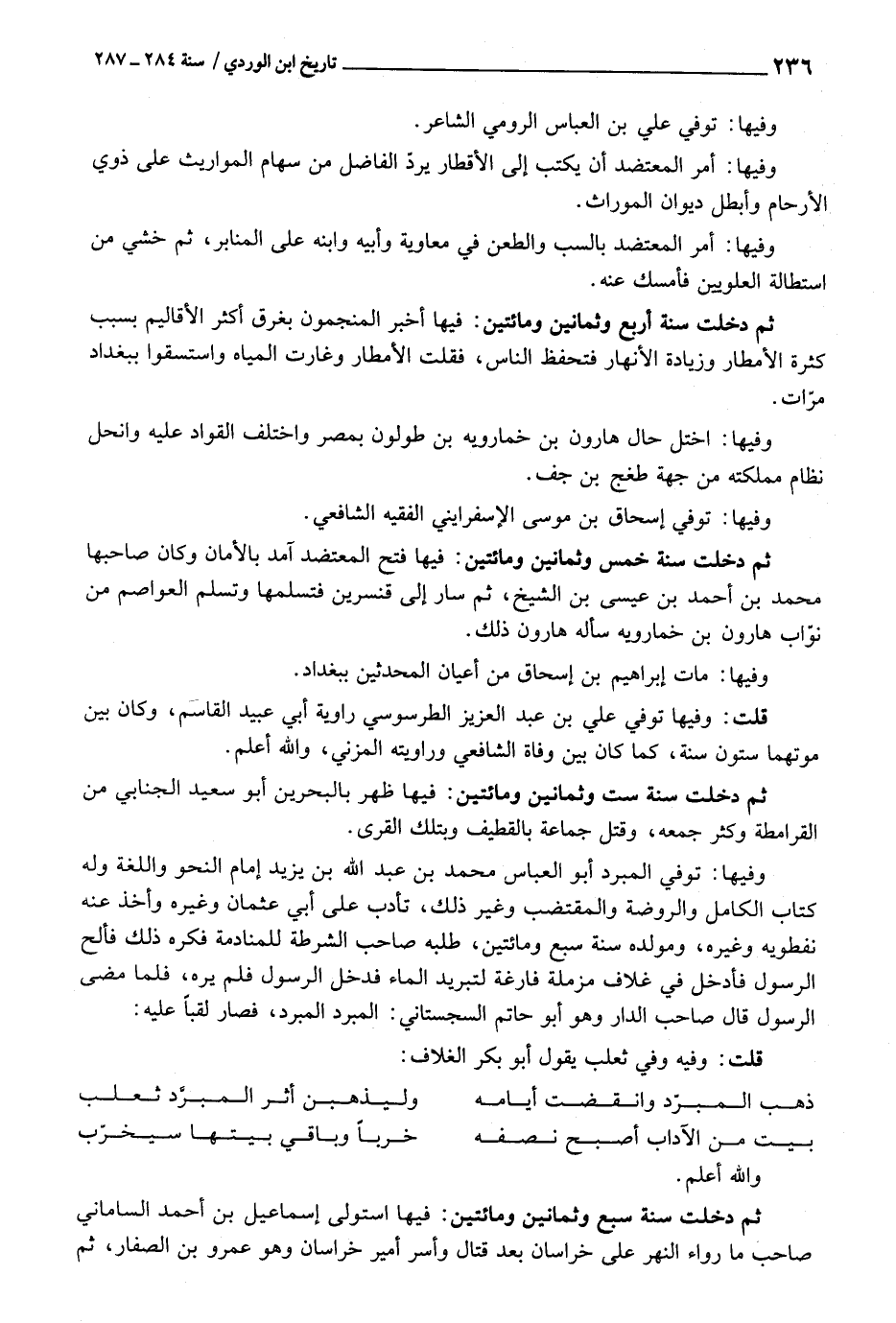 وفيهَا: توفّي الْمبرد أَبُو الْعَبَّاس مُحَمَّد بن عبد اللَّهِ بن يزِيد إِمَام النَّحْو واللغة وَله كتاب الْكَامِل وَالرَّوْضَة والمقتضب وَغير ذَلِك، تأدب على أبي عُثْمَان وَغَيره وَأخذ عَنهُ نفطويه وَغَيره، ومولده سنة سبع وَمِائَتَيْنِ، طلبه صَاحب الشرطة للمنادمة فكرة ذَلِك فألح الرَّسُول فَأدْخل فِي غلاف مزملة فارغة لتبريد المَاء فَدخل الرَّسُول فَلم يره، فَلَمَّا مضى الرَّسُول قَالَ صَاحب الدَّار وَهُوَ أَبُو حَاتِم السجسْتانِي: الْمبرد الْمبرد، فَصَارَ لقبا عَلَيْهِ:
