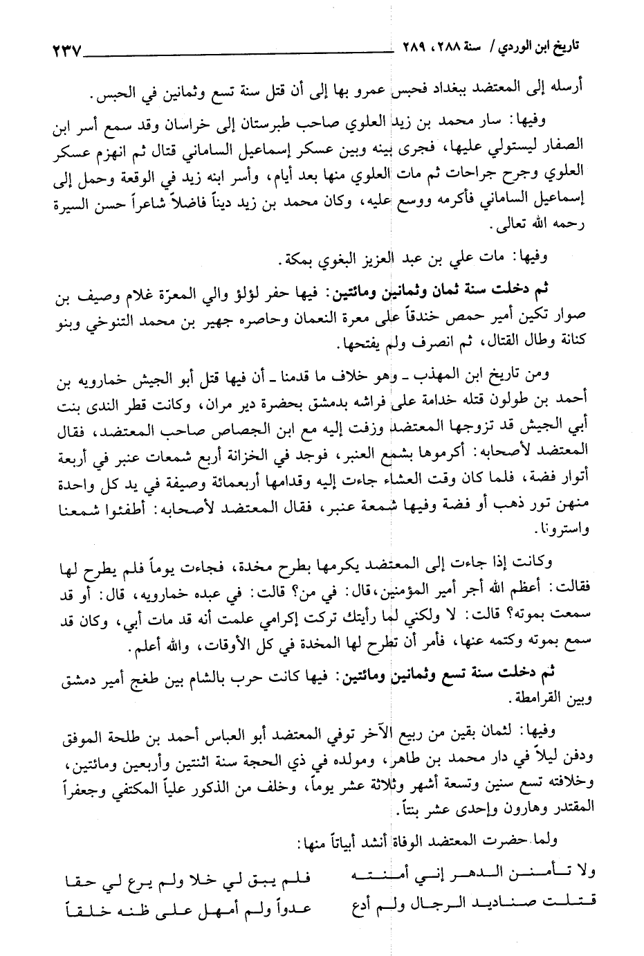 ثمَّ دخلت سنة تسع وَثَمَانِينَ وَمِائَتَيْنِ: فِيهَا كَانَت حَرْب بِالشَّام بَين طغج أَمِير دمشق وَبَين القرامطة.