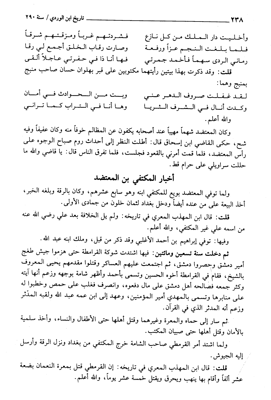 وَلما توفّي المعتضد بُويِعَ للمكتفي ابْنه وَهُوَ سَابِع عشرهم، وَكَانَ بالرقة وبلغه الْخَبَر، أَخذ الْبيعَة على من عِنْده أَيْضا وَدخل بَغْدَاد لثمان خلون من جمادي الأولى.
