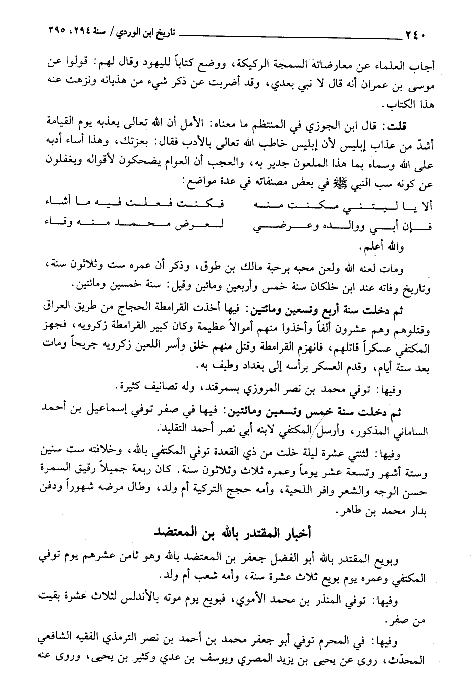 ثمَّ دخلت سنة خمس وَتِسْعين وَمِائَتَيْنِ: فِيهَا فِي صفر توفّي إِسْمَاعِيل بن أَحْمد الساماني الْمَذْكُور، وَأرْسل المكتفي لِابْنِهِ أبي نصر أَحْمد التَّقْلِيد.