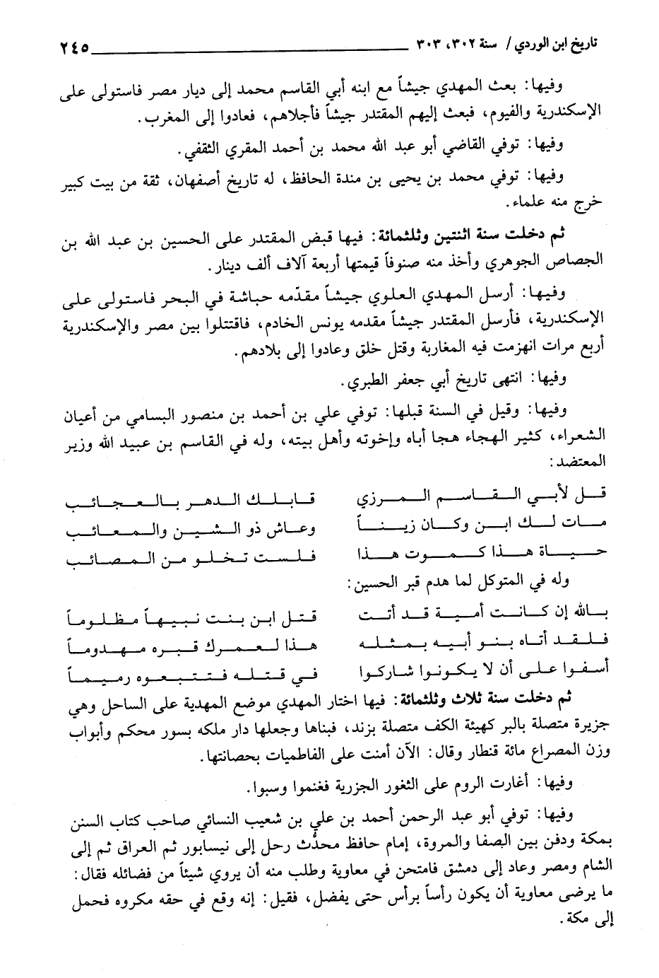 وفيهَا: توفّي أَبُو عبد الرَّحْمَن أَحْمد بن عَليّ بن شُعَيْب النَّسَائِيّ صَاحب كتاب السّنَن بِمَكَّة وَدفن بَين الصَّفَا والمروة، إِمَام حَافظ مُحدث رَحل إِلَى نيسابور ثمَّ الْعرَاق ثمَّ إِلَى الشَّام ومصر وَعَاد إِلَى دمشق فامتحن فِي مُعَاوِيَة وَطلب مِنْهُ أَن يروي شَيْئا من فضائله فَقَالَ: مَا يرضى مُعَاوِيَة أَن يكون رَأْسا بِرَأْس حَتَّى يفضل، فَقيل: إِنَّه وَقع فِي حَقه مَكْرُوه فَحمل إِلَى مَكَّة.