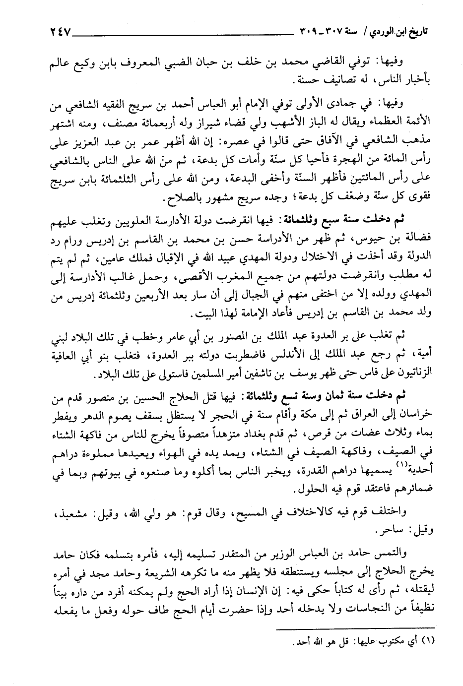 ثمَّ دخلت سنة ثَمَان وَسنة تسع وثلثمائة: فِيهَا قتل الحلاج الْحُسَيْن بن مَنْصُور قدم من خُرَاسَان إِلَى الْعرَاق ثمَّ إِلَى مَكَّة وَأقَام سنة فِي الْحجر لَا يستظل بسقف يَصُوم الدَّهْر وَيفْطر بِمَاء وَثَلَاث عضات من قرص، ثمَّ قدم بَغْدَاد متزهدا متصوفا يخرج للنَّاس من فَاكِهَة الشتَاء فِي الصَّيف، وَفَاكِهَة الصَّيف فِي الشتَاء، ويمد يَده فِي الْهَوَاء وَيُعِيدهَا مَمْلُوءَة دَرَاهِم أحدية يسميها دَرَاهِم الْقُدْرَة، ويخبر النَّاس بِمَا أكلوه وَمَا صنعوه فِي بُيُوتهم وَبِمَا فِي ضمائرهم فَاعْتقد قوم فِيهِ الْحُلُول.