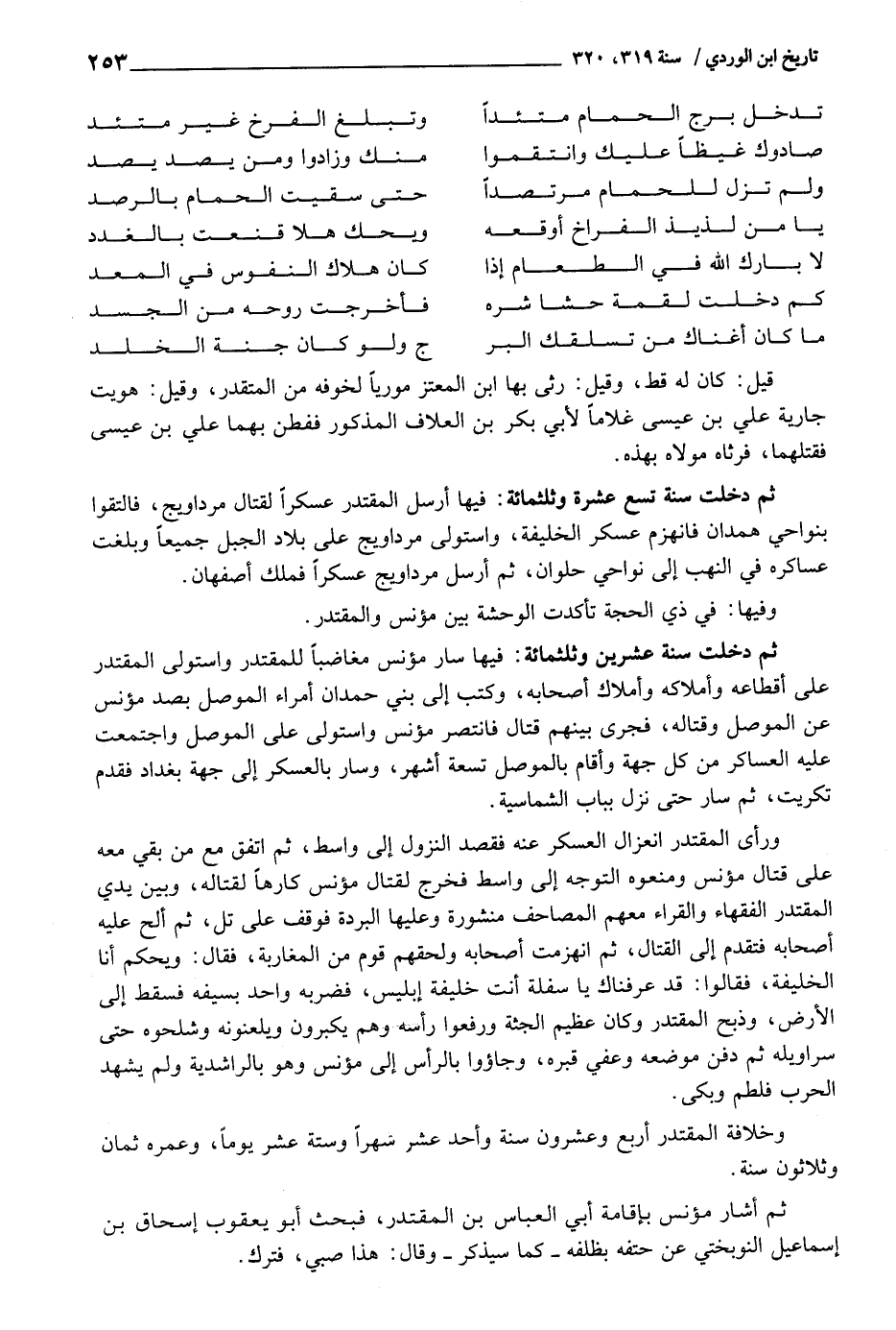 وَرَأى المقتدر انعزال الْعَسْكَر عَنهُ فقصد النُّزُول إِلَى وَاسِط، ثمَّ اتّفق مَعَ من بَقِي مَعَه على قتال مؤنس ومنعوه التَّوَجُّه إِلَى وَاسِط فَخرج لقِتَال مؤنس كَارِهًا لقتاله، وَبَين يَدي المقتدر الْفُقَهَاء والقراء مَعَهم الْمَصَاحِف منشورة وَعَلَيْهَا الْبردَة فَوقف على تل، ثمَّ ألح عَلَيْهِ أَصْحَابه فَتقدم إِلَى الْقِتَال، ثمَّ انْهَزَمت أَصْحَابه ولحقهم قوم من المغاربة، فَقَالَ: وَيحكم أَنا الْخَلِيفَة، فَقَالُوا: قد عرفناك يَا سفلَة أَنْت خَليفَة إِبْلِيس، فَضَربهُ وَاحِد بِسَيْفِهِ فَسقط إِلَى الأَرْض، وَذبح المقتدر وَكَانَ عَظِيم الجثة وَرفعُوا رَأسه وهم يكبرُونَ ويلعنونه وشلحوه حَتَّى سراويله ثمَّ دفن مَوْضِعه وعفي قَبره، وجاؤوا بِالرَّأْسِ إِلَى مؤنس وَهُوَ بالراشدية وَلم يشْهد الْحَرْب فلطم وَبكى.