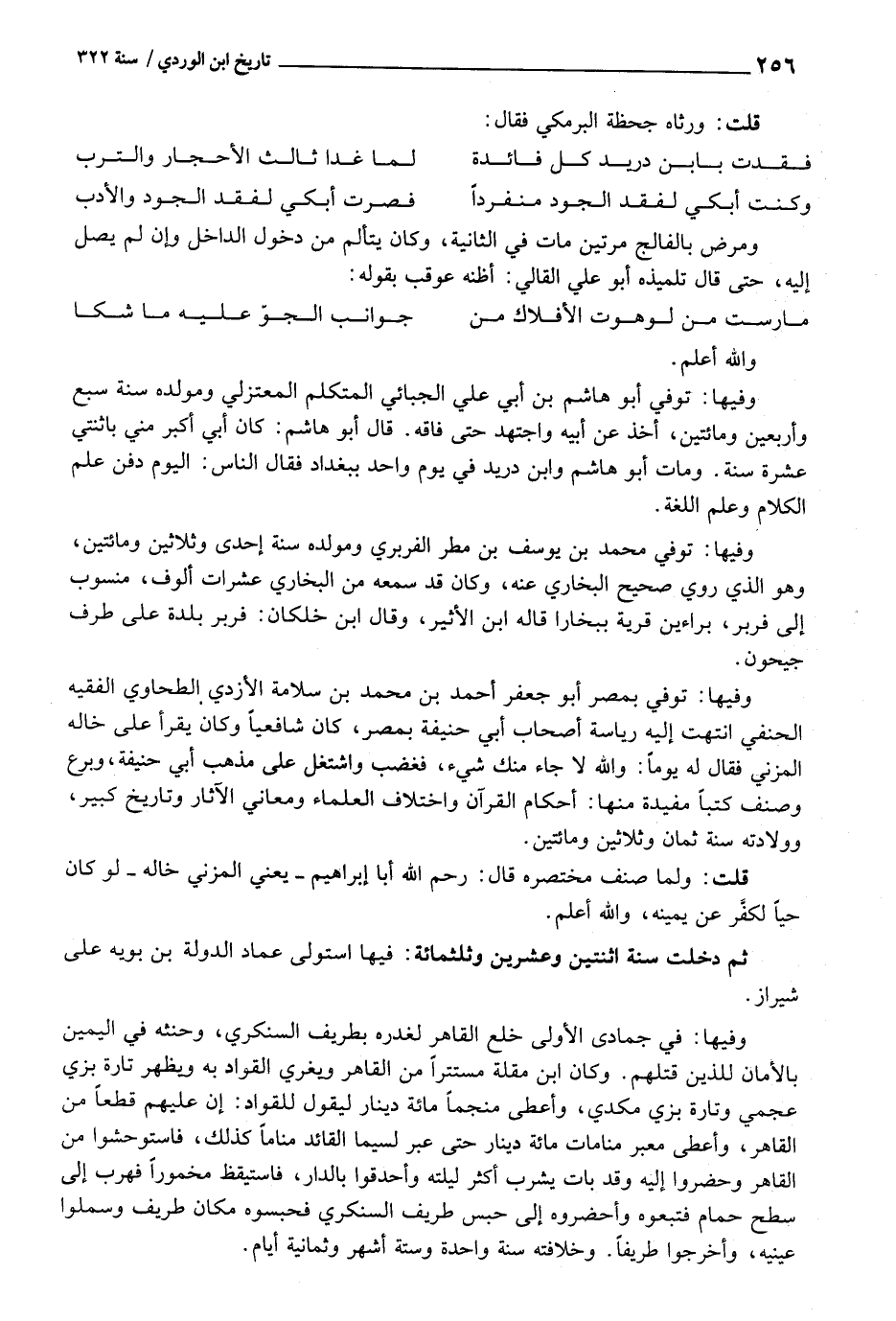 وفيهَا: توفّي أَبُو هَاشم بن أبي عَليّ الجبائي الْمُتَكَلّم المعتزلي ومولده سنة سبع وَأَرْبَعين وَمِائَتَيْنِ، أَخذ عَن أَبِيه واجتهد حَتَّى فاقه. قَالَ أَبُو هَاشم: كَانَ أبي أكبر مني باثنتي عشرَة سنة. وَمَات أَبُو هَاشم وَابْن دُرَيْد فِي يَوْم وَاحِد بِبَغْدَاد فَقَالَ النَّاس: الْيَوْم دفن علم الْكَلَام وَعلم اللُّغَة.