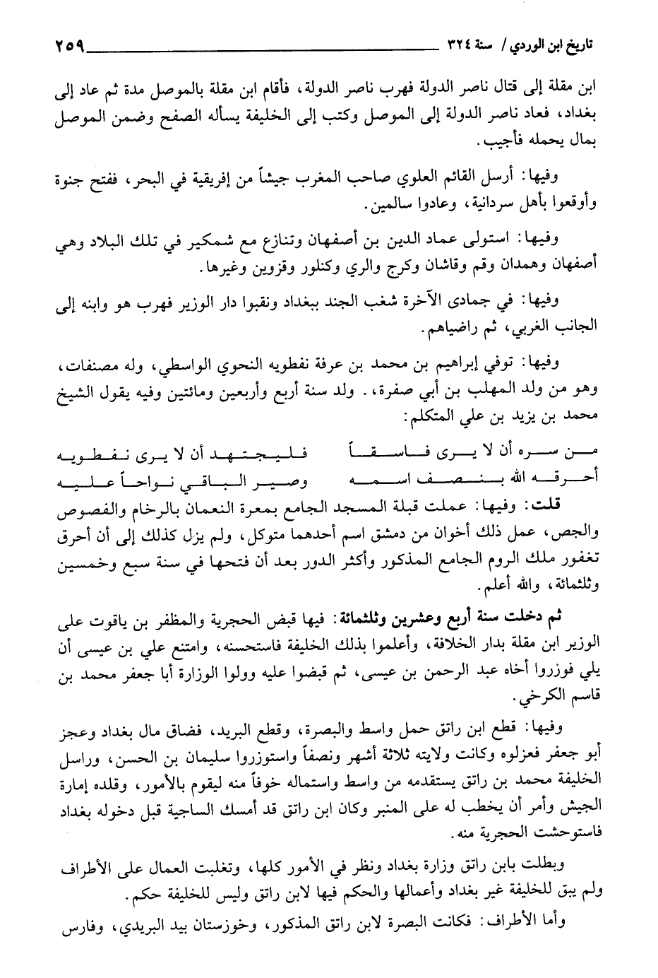 وفيهَا: فِي جمادي الْآخِرَة شغب الْجند بِبَغْدَاد ونقبوا دَار الْوَزير فهرب هُوَ وَابْنه إِلَى الْجَانِب الغربي، ثمَّ راضياهم.