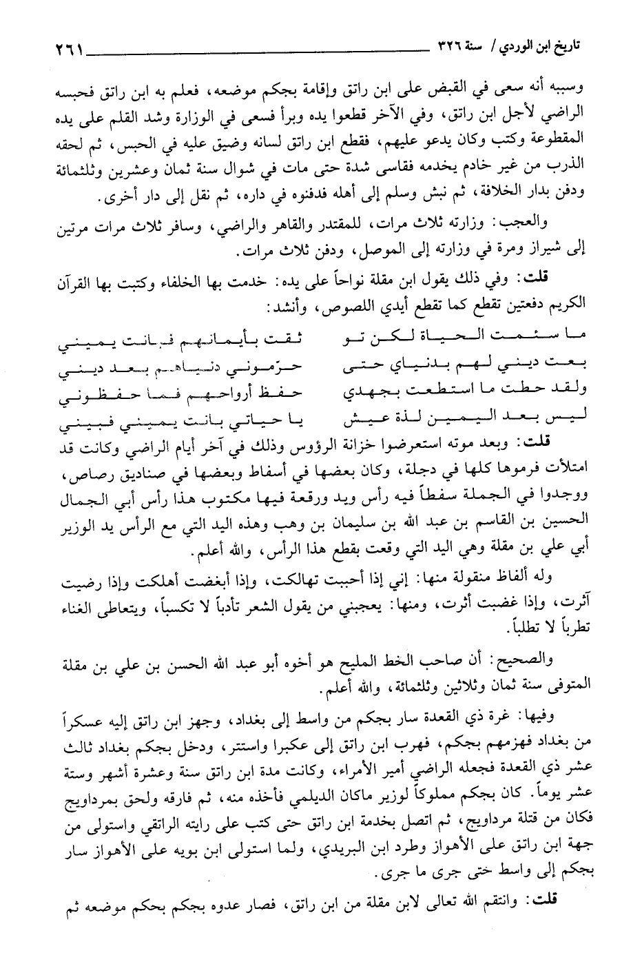 قلت: وَفِي ذَلِك يَقُول ابْن مقلة نواحا على يَده: خدمت بهَا الْخُلَفَاء وكتبت بهَا الْقُرْآن الْكَرِيم دفعتين تقطع كَمَا تقطع أَيدي اللُّصُوص، وَأنْشد: