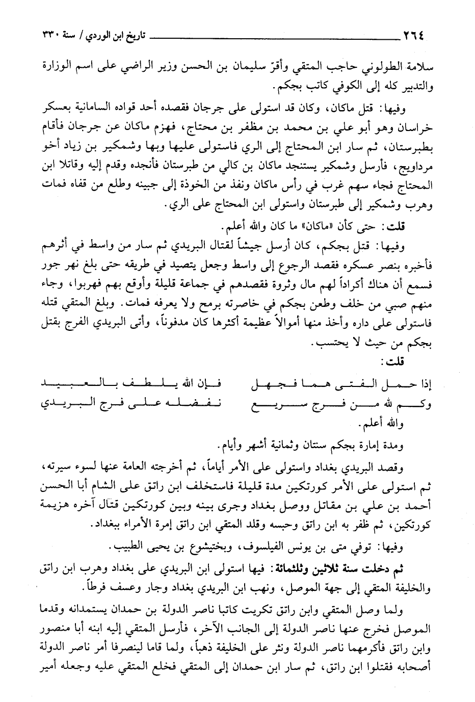 ثمَّ دخلت سنة ثَلَاثِينَ وثلثمائة: فِيهَا استولى ابْن البريدي على بَغْدَاد وهرب ابْن راتق والخليفة المتقي إِلَى جِهَة الْموصل، وَنهب ابْن البريدي بَغْدَاد وجار وعسف فرطا.