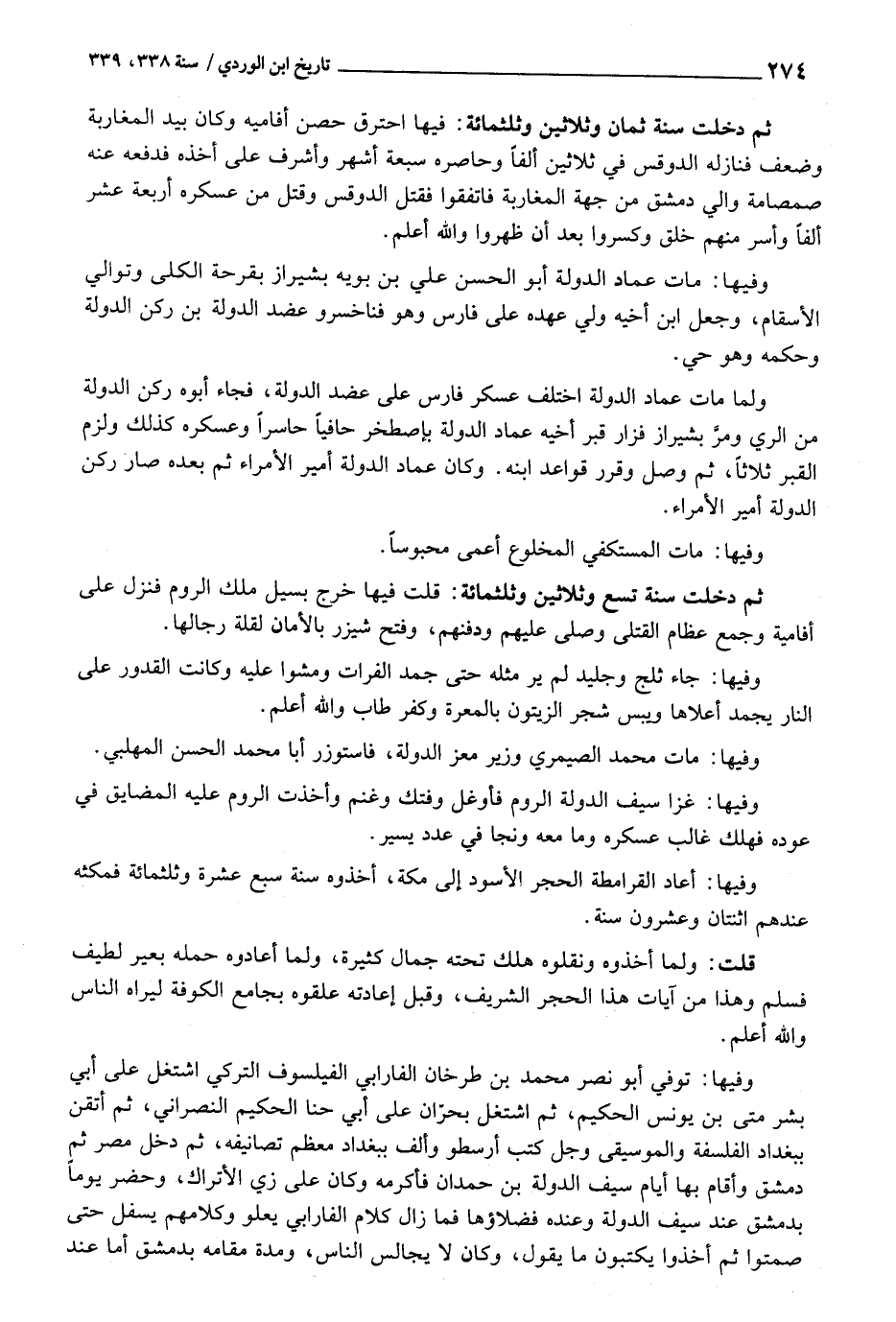 وفيهَا توفّي أَبُو نصر مُحَمَّد بن طرخان الفارابي الفيلسوف التركي اشْتغل على أبي بشر مَتى بن يُونُس الْحَكِيم، ثمَّ اشْتغل بحران على أبي حنا الْحَكِيم النَّصْرَانِي، ثمَّ أتقن بِبَغْدَاد الفلسفة والموسيقى وَجل كتب أرسطو وَألف بِبَغْدَاد مُعظم تصانيفه، ثمَّ دخل مصر ثمَّ دمشق وَأقَام بهَا أَيَّام سيف الدولة بن حمدَان فَأكْرمه وَكَانَ على زِيّ الأتراك، وَحضر يَوْمًا بِدِمَشْق عِنْد سيف الدولة وَعِنْده فضلاؤها فَمَا زَالَ كَلَام الفارابي يَعْلُو وَكَلَامهم يسفل حَتَّى صمتوا ثمَّ أخذُوا يَكْتُبُونَ مَا يَقُول، وَكَانَ لَا يُجَالس النَّاس، وَمُدَّة مقَامه بِدِمَشْق أما عِنْد