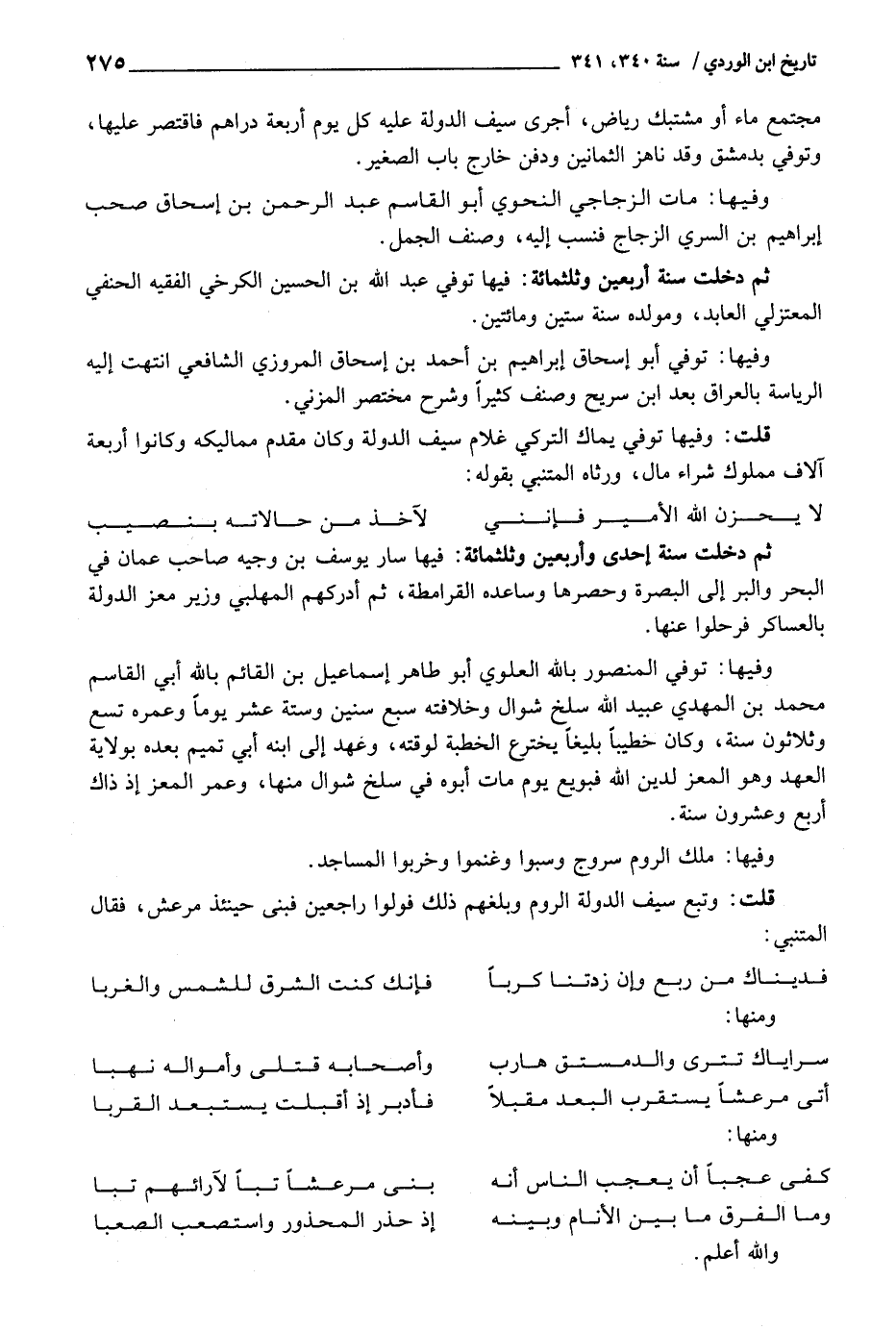 ثمَّ دخلت سنة أَرْبَعِينَ وثلثمائة: فِيهَا توفّي عبد اللَّهِ بن الْحُسَيْن الْكَرْخِي الْفَقِيه الْحَنَفِيّ المعتزلي العابد، ومولده سنة سِتِّينَ وَمِائَتَيْنِ.