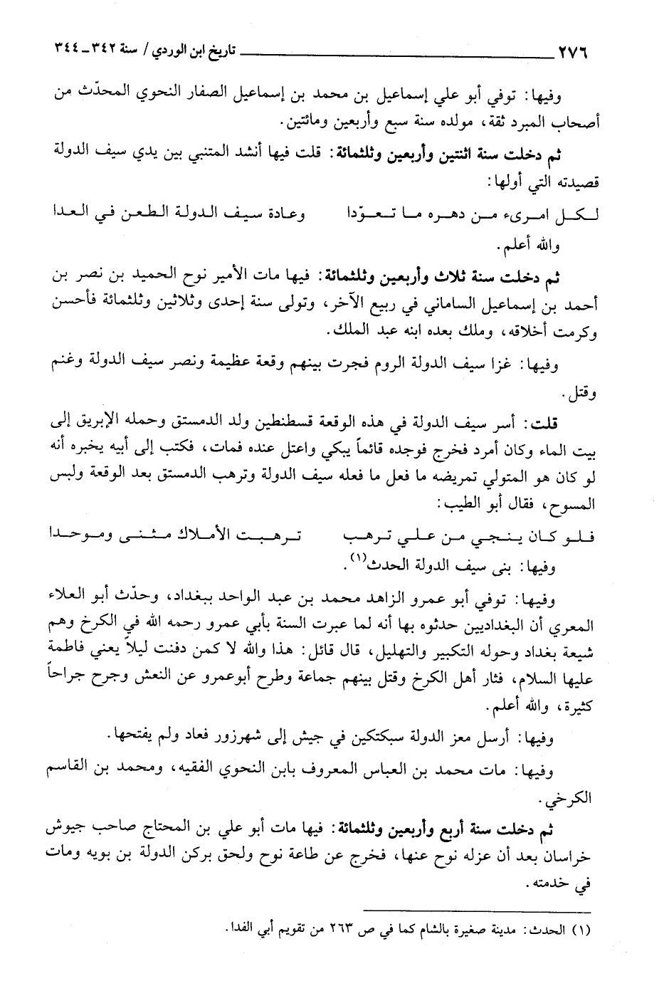 ثمَّ دخلت سنة اثنيتين وَأَرْبَعين وثلثمائة: قلت فِيهَا أنْشد المتنبي بَين يَدي سيف الدولة قصيدته الَّتِي أَولهَا: