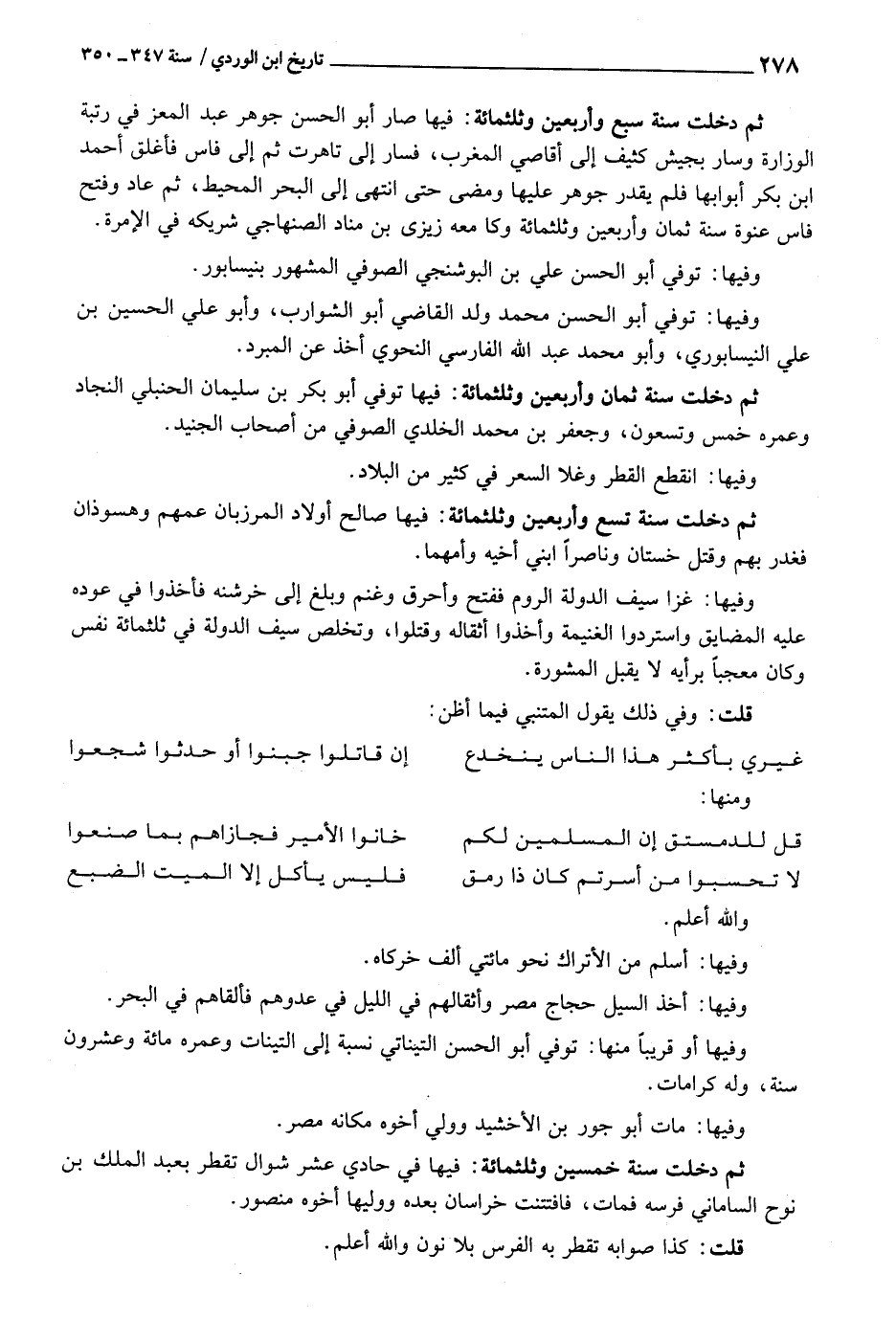 ثمَّ دخلت سنة ثَمَان وَأَرْبَعين وثلثمائة: فِيهَا توفّي أَبُو بكر بن سُلَيْمَان الْحَنْبَلِيّ النجاد وعمره خمس وَتسْعُونَ، وجعفر بن مُحَمَّد الْخُلْدِيِّ الصُّوفِي من أَصْحَاب الْجُنَيْد.