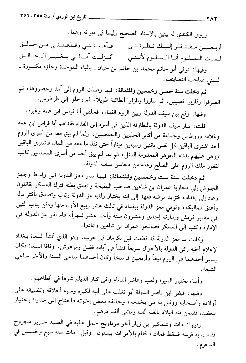 ثمَّ دخلت سنة خمس وَخمسين وثلثمائة: فِيهَا وصلت الرّوم إِلَى آمد وحصروها، ثمَّ انصرفوا وقاربوا نَصِيبين، ثمَّ سَارُوا ونازلوا أنطاكية طَويلا، ثمَّ رحلوا إِلَى طرطوس.