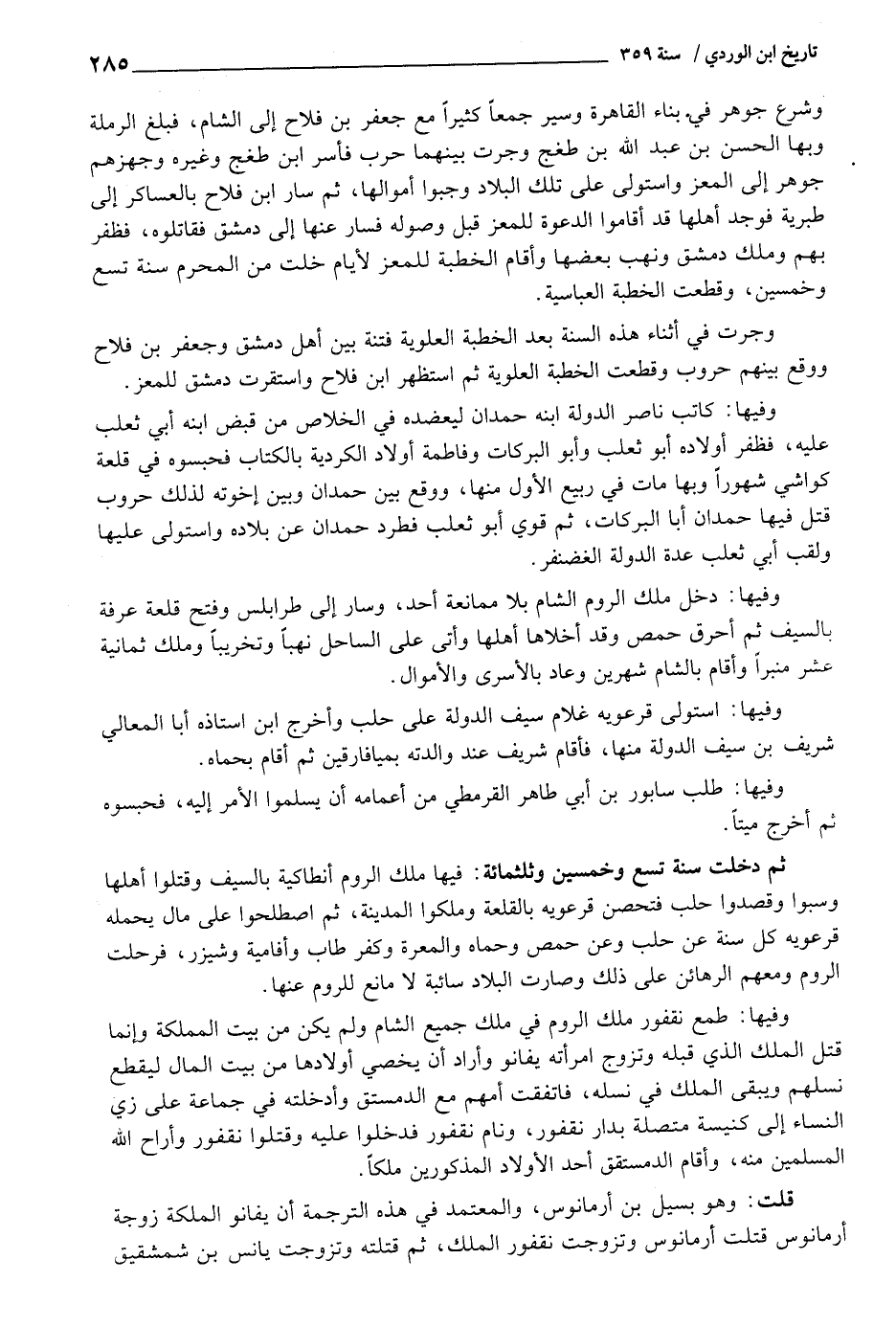 وفيهَا: دخل ملك الرّوم الشَّام بِلَا ممانعة أحد، وَسَار إِلَى طرابلس وَفتح قلعة عَرَفَة بِالسَّيْفِ ثمَّ أحرق حمص وَقد أخلاها أَهلهَا وأتى على السَّاحِل نهبا وتخريبا وَملك ثَمَانِيَة عشر منبرا وَأقَام بِالشَّام شَهْرَيْن وَعَاد بالأسرى وَالْأَمْوَال.