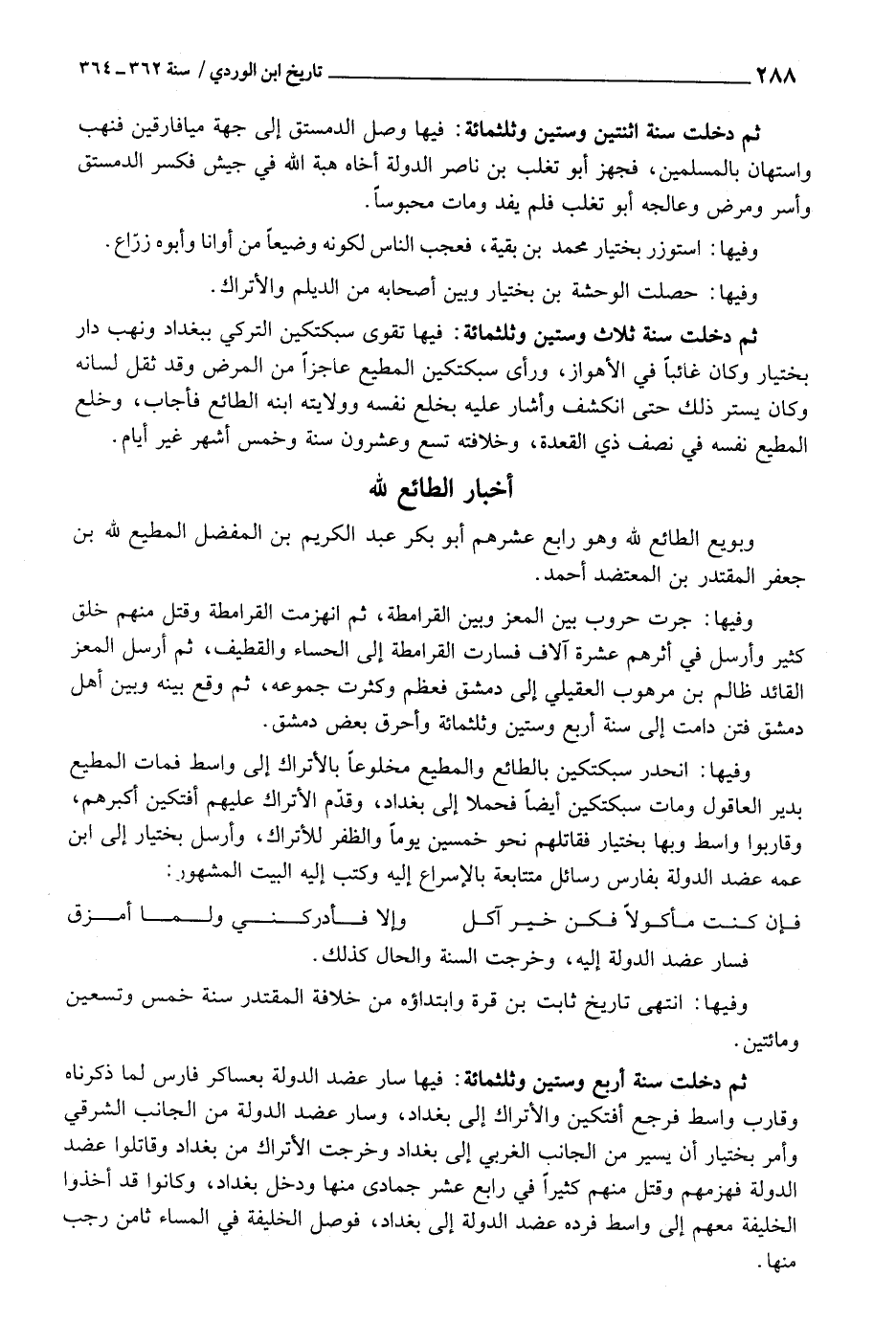 ثمَّ دخلت سنة اثْنَتَيْنِ وَسِتِّينَ وثلثمائة: فِيهَا وصل الدمستق إِلَى جِهَة ميارفارقين فنهب واستهان بِالْمُسْلِمين، فَجهز أَبُو تغلب بن نَاصِر الدولة أَخَاهُ هبة اللَّهِ فِي جَيش فَكسر الدمستق وَأسر وَمرض وعالجه أَبُو تغلب فَلم يفد وَمَات مَحْبُوسًا.