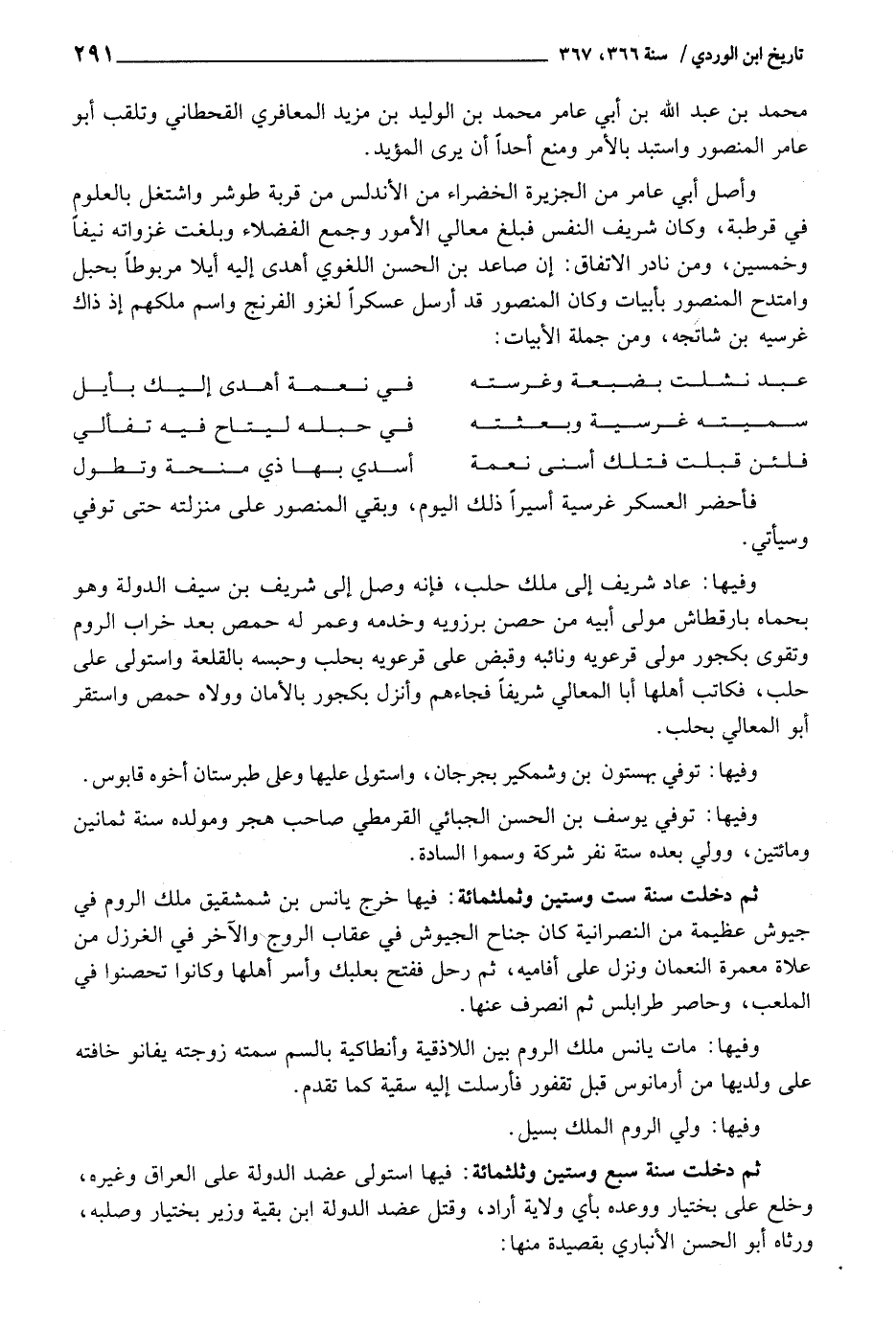 ثمَّ دخلت سنّ سِتّ وَسِتِّينَ وثلثمائة: فِيهَا خرج يانس بن شمشقيق ملك الرّوم فِي جيوش عَظِيمَة من النَّصْرَانِيَّة كَانَ جنَاح الجيوش فِي عِقَاب الروج والاخر فِي الغرزل من علاة معمرة النُّعْمَان وَنزل على أفاميه، ثمَّ رَحل فَفتح بعلبك وَأسر أَهلهَا وَكَانُوا تحَصَّنُوا فِي الملعب، وحاصر طرابلس ثمَّ انْصَرف عَنْهَا.