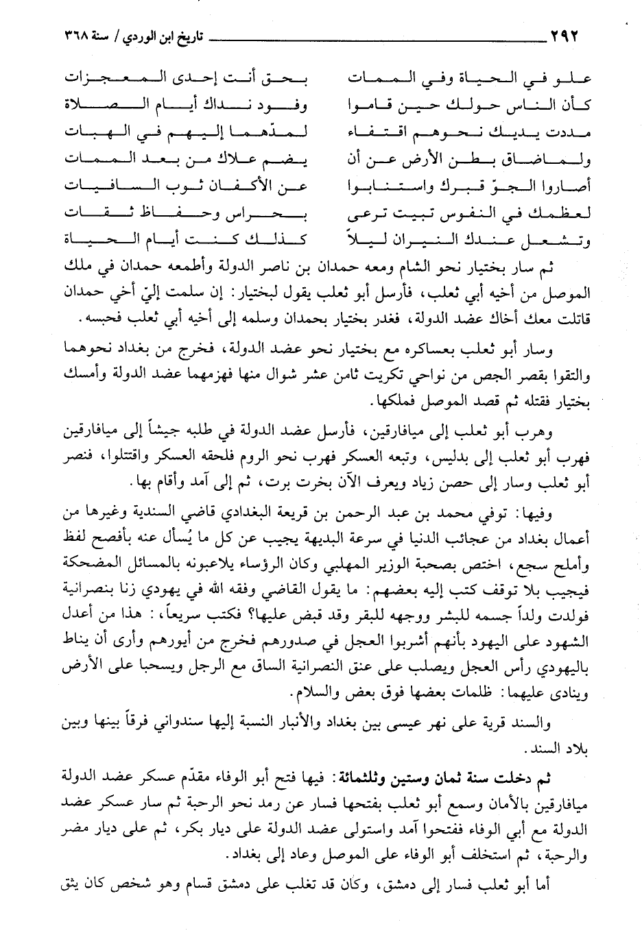 ثمَّ دخلت سنة ثَمَان وَسِتِّينَ وثلثمائة: فِيهَا فتح أَبُو الْوَفَاء مقدم عَسْكَر عضد الدولة ميافارقين بالأمان وَسمع أَبُو ثَعْلَب بِفَتْحِهَا فَسَار عَن رمد نَحْو الرحبة ثمَّ سَار عَسْكَر عضد الدولة مَعَ أبي الْوَفَاء ففتحوا آمد وَاسْتولى عضد الدولة على ديار بكر، ثمَّ على ديار مُضر والرحبة، ثمَّ اسْتخْلف أَبُو الْوَفَاء على الْموصل وَعَاد إِلَى بَغْدَاد.