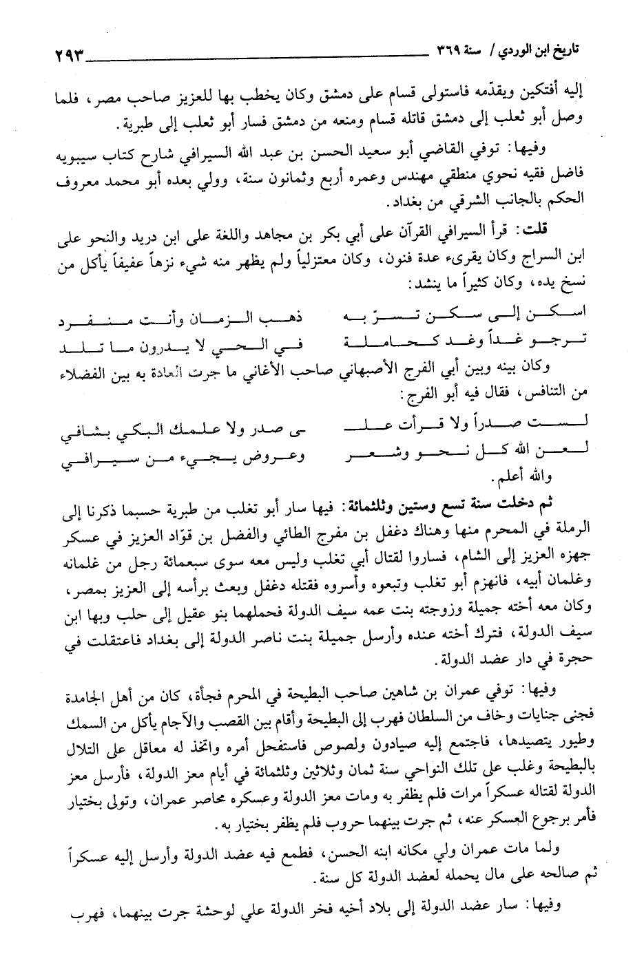 وفيهَا توفّي القَاضِي أَبُو سعيد الْحسن بن عبد اللَّهِ السيرافي شَارِح كتاب سِيبَوَيْهٍ فَاضل فَقِيه نحوي منطقي مهندس وعمره أَربع وَثَمَانُونَ سنة، وَولي بعده أَبُو مُحَمَّد مَعْرُوف الحكم بالجانب الشَّرْقِي من بَغْدَاد.