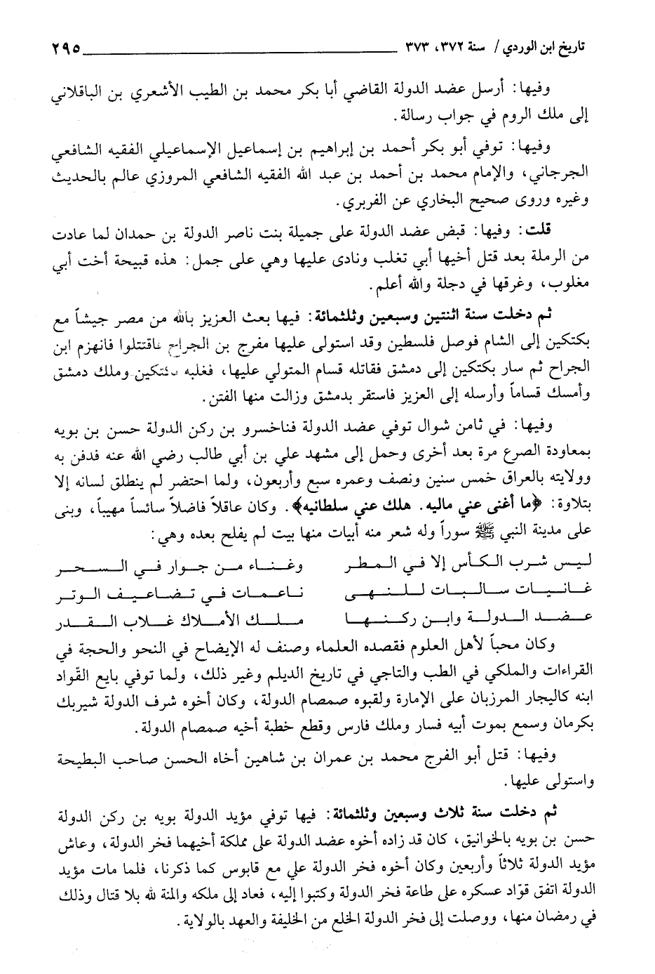 وفيهَا: فِي ثامن شَوَّال توفّي عضد الدولة فناخسرو بن ركن الدولة وَحسن بن بويه بمعاودة الصرع مرّة بعد أُخْرَى وَحمل إِلَى مشْهد عَليّ بن أبي طَالب رَضِي اللَّهِ عَنهُ فَدفن بِهِ وولايته بالعراق خمس سِنِين وَنصف وعمره سبع وَأَرْبَعُونَ، وَلما احْتضرَ لم ينْطَلق لِسَانه إِلَّا بِتِلَاوَة: {مَا أغْنى عني ماليه. هلك عني سلطانية} . وَكَانَ عَاقِلا فَاضلا سائسا مهيبا، وَبنى على مَدِينَة النَّبِي - صَلَّى اللَّهُ عَلَيْهِ وَسَلَّم َ - سورا وَله شعر مِنْهُ أَبْيَات مِنْهَا بَيت لم يفلح بعده وَهِي: