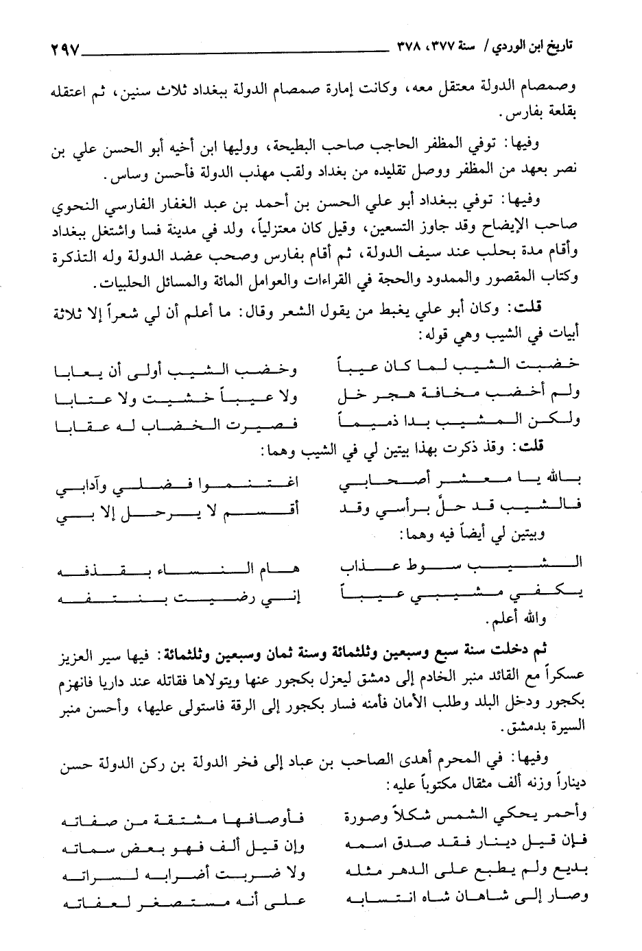 وفيهَا: توفّي بِبَغْدَاد أَبُو عَليّ الْحسن بن أَحْمد بن عبد الْغفار الْفَارِسِي النَّحْوِيّ صَاحب الْإِيضَاح وَقد جَاوز التسعين، وَقيل كَانَ معتزليا، ولد فِي مَدِينَة فسا واشتغل بببغداد وَأقَام مُدَّة بحلب عِنْد سيف الدولة، ثمَّ أَقَامَ بِفَارِس وَصَحب عضد الدولة وَله التَّذْكِرَة وَكتاب الْمَقْصُور والممدود وَالْحجّة فِي الْقرَاءَات والعوامل الْمِائَة والمسائل الحلبيات.