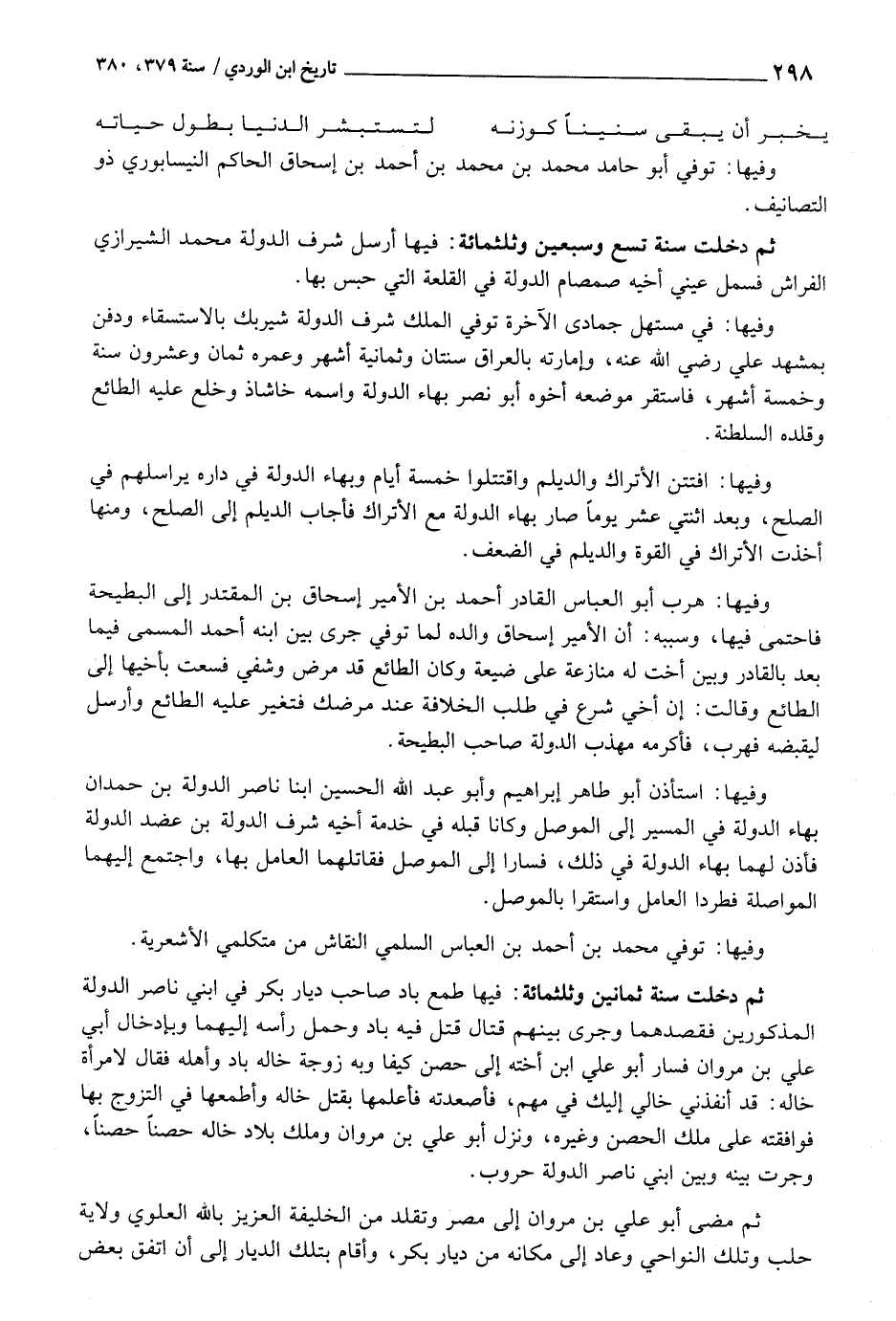 ثمَّ دخلت سنة تسع وَسبعين وثلثمائة: فِيهَا أرسل شرف الدولة مُحَمَّد الشِّيرَازِيّ الْفراش فسمل عَيْني أَخِيه صمصام الدولة فِي القلعة الَّتِي حبس بهَا.