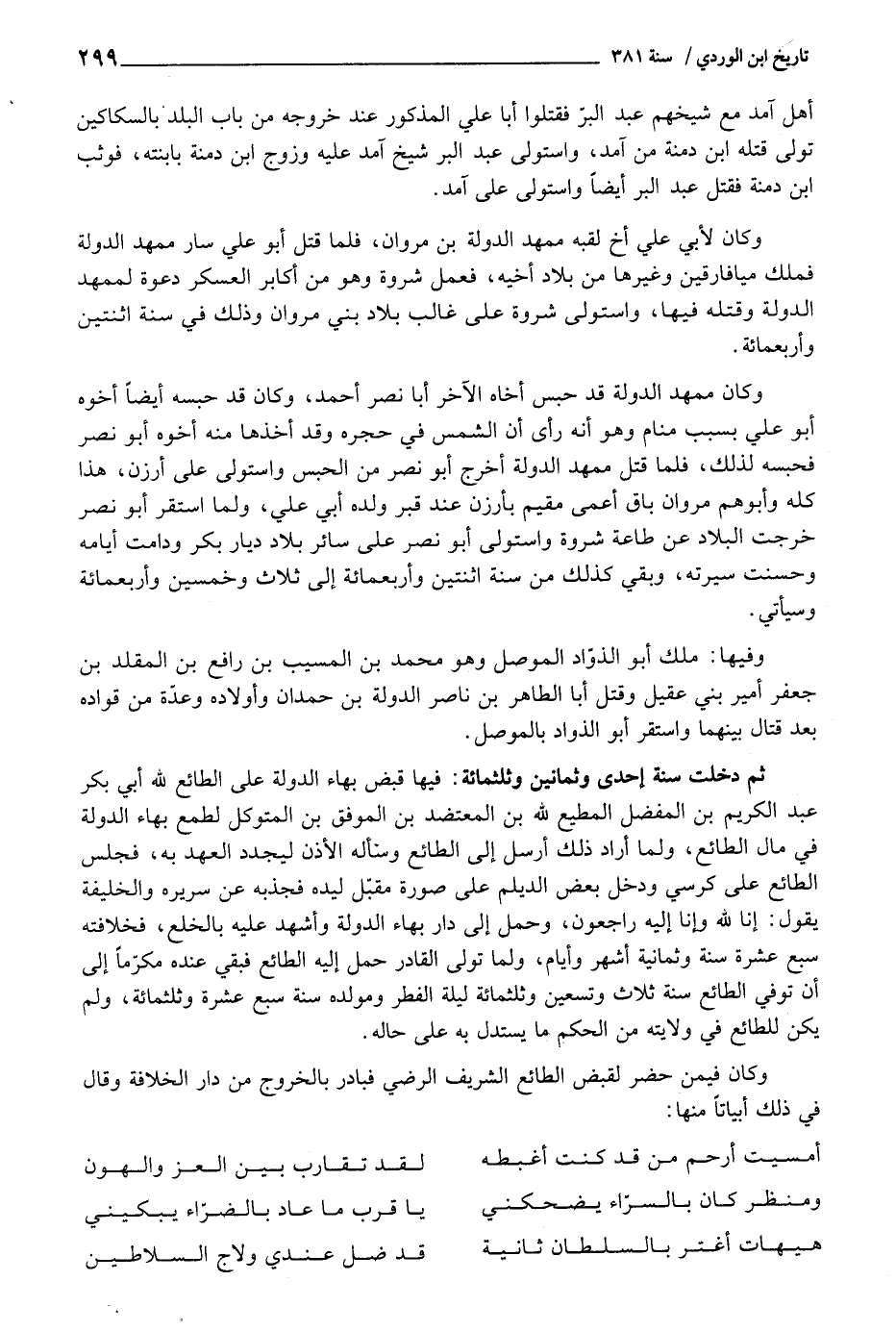 ثمَّ دخلت سنة إِحْدَى ثَمَانِينَ وثلثمائة: فِيهَا قبض بهاء الدولة على الطائع لله أبي بكر عبد الْكَرِيم بن الْمفضل الْمُطِيع لله بن المعتضد بن الْمُوفق بن المتَوَكل لطمع بهاء الدولة فِي مَال الطائع، وَلما أَرَادَ ذَلِك أرسل إِلَى الطائع وَسَأَلَهُ الْأذن ليجدد الْعَهْد بِهِ، فَجَلَسَ الطائع على كرْسِي وَدخل بعض الديلم على صُورَة مقبل ليده فَجَذَبَهُ عَن سَرِيره والخليفة يَقُول: إِنَّا لله وَأَنا إِلَيْهِ رَاجِعُون، وَحمل إِلَى دَار بهاء الدولة وَأشْهد عَلَيْهِ بِالْخلْعِ، فخلافته سبع عشرَة سنة وَثَمَانِية أشهر وَأَيَّام، وَلما تولى الْقَادِر حمل إِلَيْهِ الطائع فَبَقيَ عِنْده مكرما إِلَى أَن توفّي الطائع سنة ثَلَاث وَتِسْعين وثلثمائة لَيْلَة الْفطر ومولده سنة سبع عشرَة وثلثمائة، وَلم يكن للطائع فِي ولَايَته من الحكم مَا يسْتَدلّ بِهِ على حَاله.