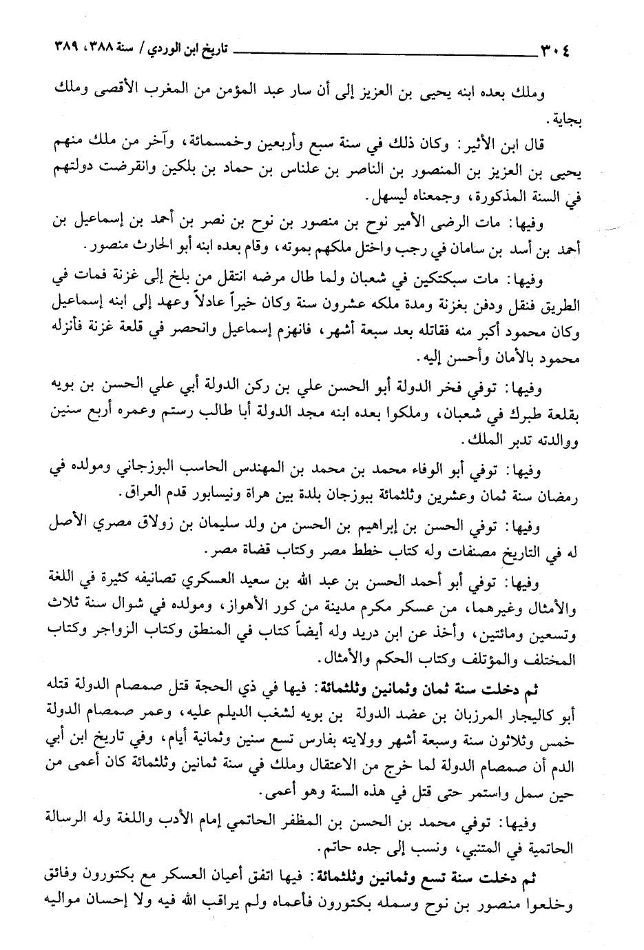 وفيهَا: توفّي أَبُو الْوَفَاء مُحَمَّد بن مُحَمَّد بن المهندس الحاسب البوزجاني ومولده فِي رَمَضَان سنة ثَمَان وَعشْرين وثلثمائة ببوزجان بَلْدَة بَين هراة ونيسابور قدم الْعرَاق.