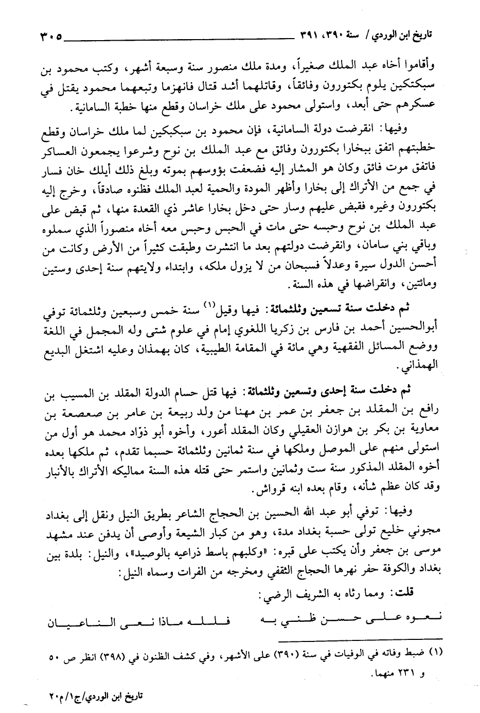 ثمَّ دخلت سنة تسعين وثلثمائة: فِيهَا وَقيل سنة خمس وَسبعين وثلثمائة توفّي أَبُو الْحُسَيْن أَحْمد بن فَارس بن زَكَرِيَّا اللّغَوِيّ إِمَام فِي عُلُوم شَتَّى وَله الْمُجْمل فِي اللُّغَة وَوضع الْمسَائِل الْفِقْهِيَّة وَهِي مائَة فِي المقامة الطيبية، وَكَانَ بهمذان وَعَلِيهِ اشْتغل البديع الهمذاني.