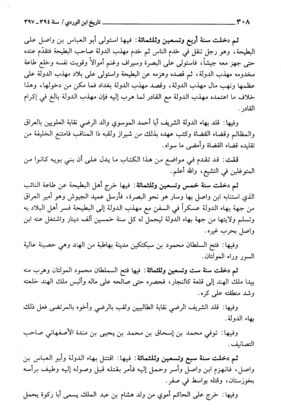 ثمَّ دخلت سنة سبع وَتِسْعين وثلثمائة: فِيهَا: اقتتل بهاء الدولة وَأَبُو الْعَبَّاس بن وَاصل، فَانْهَزَمَ ابْن واصلب وَأسر وَحمل إِلَيْهِ فَأمر بقتْله قبل وُصُوله إِلَيْهِ وطيف بِرَأْسِهِ بخوزستان، وَقَتله بِوَاسِطَة فِي صفر.