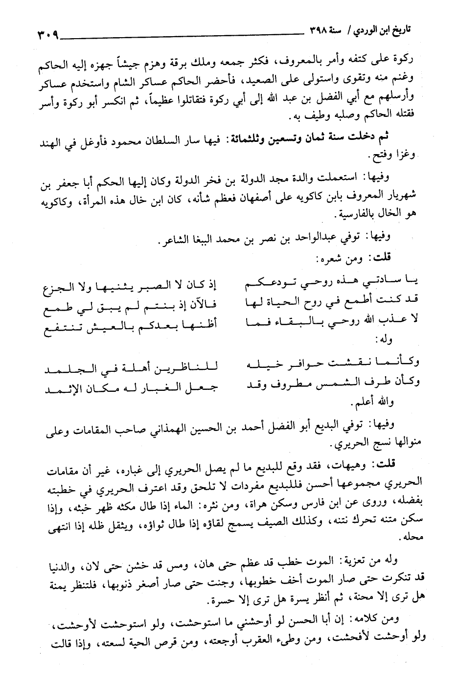 وفيهَا: توفّي البديع أَبُو الْفضل أَحْمد بن الْحُسَيْن الهمذاني صَاحب المقامات وعَلى منوالها نسج الحريري.