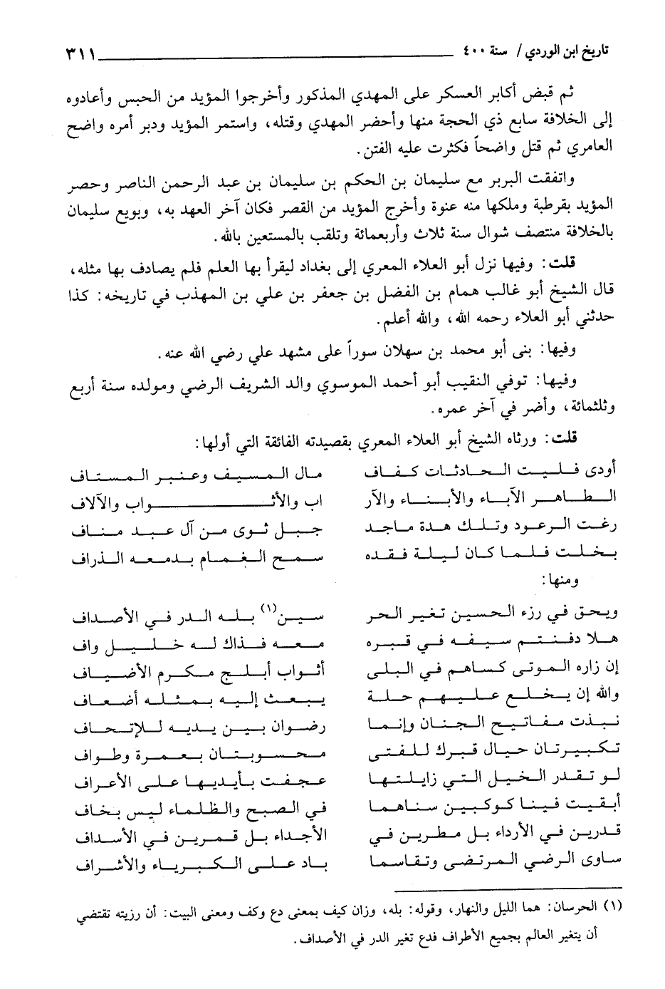 قلت: وفيهَا نزل أَبُو الْعَلَاء المعري إِلَى بَغْدَاد ليقْرَأ بهَا الْعلم فَلم يُصَادف بهَا مثله، قَالَ الشَّيْخ أَبُو غَالب همام بن الْفضل بن جَعْفَر بن عَليّ بن الْمُهَذّب فِي تَارِيخه: كَذَا حَدثنِي أَبُو الْعَلَاء رَحمَه اللَّهِ، وَالله أعلم.