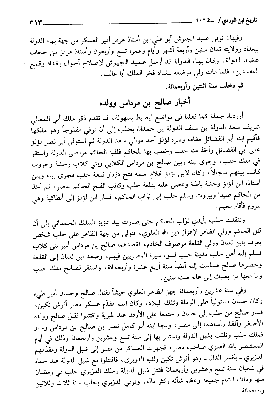 أوردناه جملَة كَمَا فعلنَا فِي مَوَاضِع ليضبط بسهولة، قد تقدم ذكر ملك أبي الْمَعَالِي شرِيف سعد الدولة بن سيف الدولة بن حمدَان بحلب إِلَى أَن توفّي مفلوجا وَهُوَ ملكهَا فأقيم ابْنه أَبُو الْفَضَائِل مقَامه وَدبره لُؤْلُؤ أحد موَالِي سعد الدولة ثمَّ استولى أَبُو نصر لُؤْلُؤ على أبي الْفَضَائِل وَأخذ مِنْهُ حلب وخطب بهَا للْحَاكِم فلقبه الْحَاكِم مرتضى الدولة وَاسْتقر فِي ملك حلب، وَجرى بَينه وَبَين صَالح بن مرداس الْكلابِي وَبني كلاب وَحْشَة وحروب كَانَت بَينهم سجالا، وَكَانَ لِابْنِ لُؤْلُؤ غُلَام اسْمه فتح دزدار قلعة حلب فَجرى بَينه وَبَين أستاذه ابْن لُؤْلُؤ وَحْشَة باطنة وَعصى عَلَيْهِ بقلعة حلب وَكَاتب الْفَتْح الْحَاكِم بِمصْر، ثمَّ أَخذ من الْحَاكِم صيدا وبيروت وَسلم حلب إِلَى نواب الْحَاكِم، فَسَار ابْن لُؤْلُؤ إِلَى أنطاكية وَهِي للروم فَأَقَامَ مَعَهم.