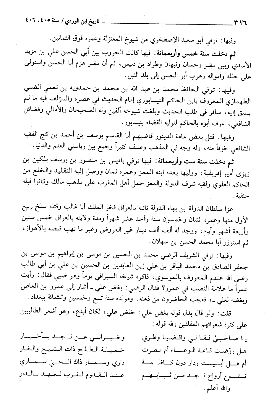 وفيهَا: توفّي الْحَافِظ مُحَمَّد بن عبد اللَّهِ بن مُحَمَّد بن حَمْدَوَيْه بن نعمب الضَّبِّيّ الطهمازي الْمَعْرُوف بِابْن الْحَاكِم النَّيْسَابُورِي إِمَام الحَدِيث فِي عصره والمؤلف فِيهِ مَا لم يسْبق إِلَيْهِ، سَافر فِي طلب الحَدِيث وَبَلغت شُيُوخه الفين وَله الصحيحان والأمالي وفضائل الشَّافِعِي، عرف أَبوهُ بالحاكم لتوليه الْقَضَاء بنيسابور.