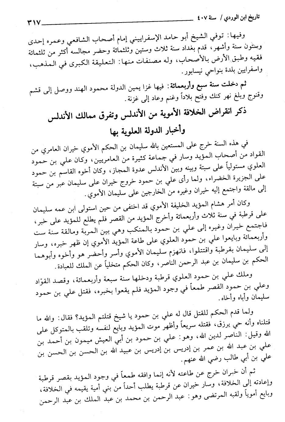 وَملك عَليّ بن حمود الْعلوِي قرطبة ودخلها سنة سَبْعَة وَأَرْبَعمِائَة، وَقصد القواد وَعلي بن حمود الْقصر طَمَعا فِي وجود الْمُؤَيد فَلم يقعوا بِخَبَرِهِ، فَقتل عَليّ بن حمود سُلَيْمَان وأباه وأخاه.