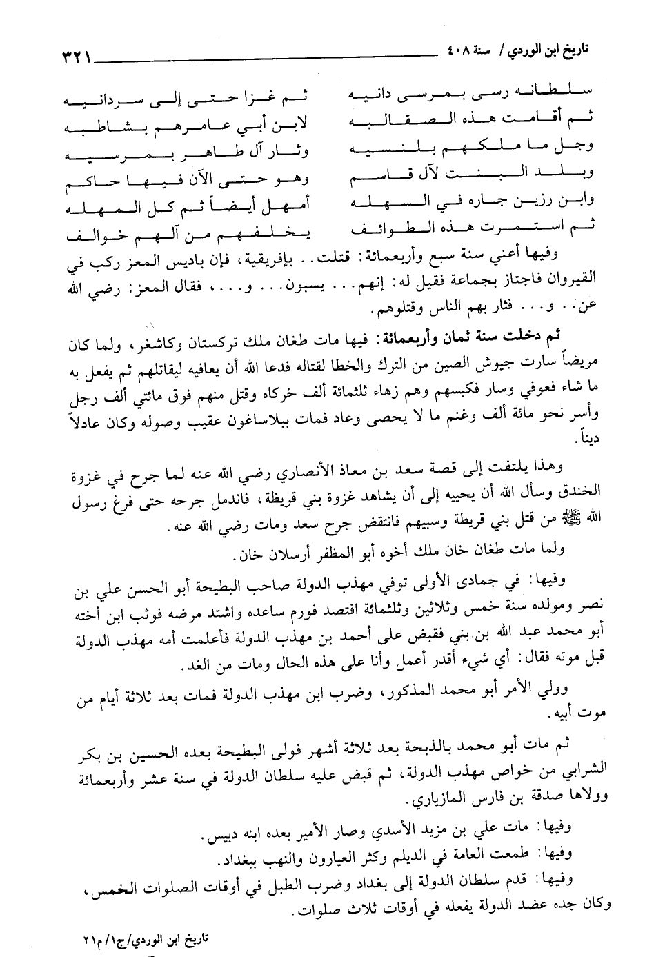 وفيهَا أَعنِي سنة سبع وَأَرْبَعمِائَة: قتلت ... ... . بإفريقية، فَإِن باديس الْمعز ركب فِي القيروان فاجتاز بِجَمَاعَة فَقيل لَهُ: إِنَّهُم ... ... يسبون ... ... . و ... ...، فَقَالَ الْمعز: رَضِي اللَّهِ عَن ... ... و ... ... . فثار بهم النَّاس وقتلوهم.