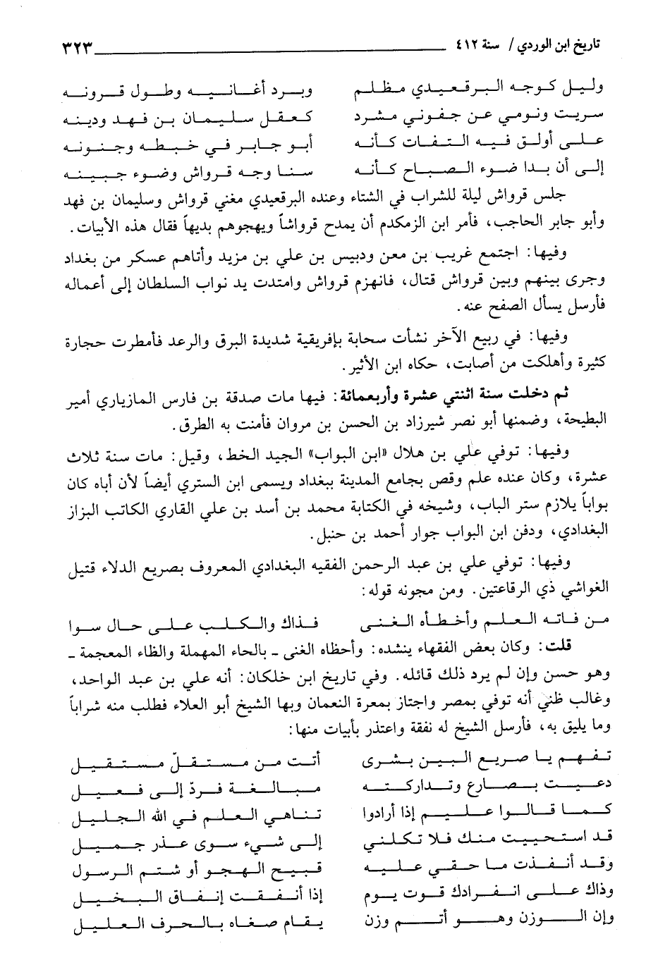 ثمَّ دخلت سنة اثْنَتَيْ عشرَة وَأَرْبَعمِائَة: فِيهَا مَاتَ صَدَقَة بن فَارس المازياري أَمِير البطيحة، وضمنها أَبُو نصر شيرزاد بن الْحسن بن مَرْوَان فأمنت بِهِ الطّرق.
