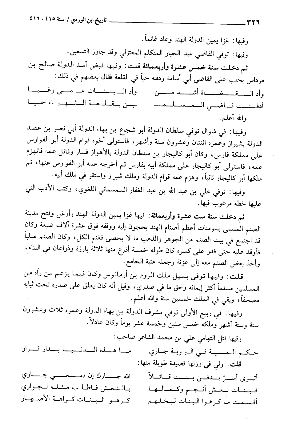 ثمَّ دخلت سنة سِتّ عشرَة وَأَرْبَعمِائَة: فِيهَا غزا يَمِين الدولة الْهِنْد وأوغل وَفتح مَدِينَة الصَّنَم الْمُسَمّى بسومنات أعظم أصنام الْهِنْد يحجون إِلَيْهِ وَوَقفه فَوق عشرَة آلَاف ضَيْعَة وَكَانَ قد اجْتمع فِي بَيت الصَّنَم من الْجَوْهَر وَالذَّهَب مَا لَا يُحْصى فغنم الْكل، وَكَانَ الصَّنَم صلبا فَأوقد عَلَيْهِ حَتَّى قدر على كَسره كَانَ طوله خَمْسَة أَذْرع مِنْهَا ثَلَاثَة بارزة وذراعان فِي الْبناء، وَأخذ بعض الصَّنَم مَعَه إِلَى غزنة وَجعله عتبَة الْجَامِع.
