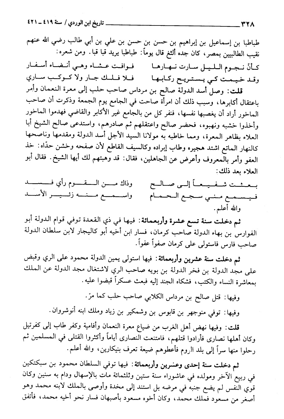 قلت: وصل أَسد الدولة صَالح بن مرداس صَاحب حلب إِلَى معرة النُّعْمَان وَأمر بعتقال أكابرها، وَسبب ذَلِك أَن امْرَأَة صاحت فِي الْجَامِع يَوْم الْجُمُعَة وَذكرت أَن صَاحب الماخور أَرَادَ أَن يغصبها نَفسهَا، فنفر كل من بالجامع غير الأكابر وَالْقَاضِي فهدموا الماخور وَأخذُوا خشبه ونهبوه، فَحَضَرَ صَالح واعتقلهم ثمَّ صادرهم، واستدعى صَالح الشَّيْخ أَبَا الْعَلَاء بِظَاهِر المعرة، وَمِمَّا خاطبه بِهِ مَوْلَانَا السَّيِّد الْأَجَل أَسد الدولة ومقدمها وناصحها كالنهار الماتع اشْتَدَّ هجيرة وطاب إبراده وكالسيف الْقَاطِع لِأَن صفحه وخشن حداه: خُذ الْعَفو وامر بِالْمَعْرُوفِ وَأعْرض عَن الْجَاهِلين، فَقَالَ: قد وهبتهم لَك أَيهَا الشَّيْخ. فَقَالَ أَبُو الْعَلَاء بعد ذَلِك: