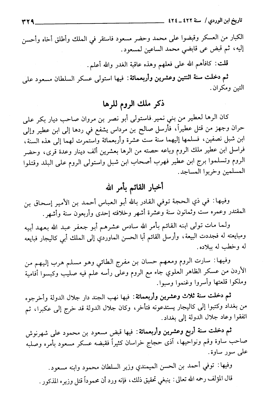 وفيهَا: فِي ذِي الْحجَّة توفّي الْقَادِر بِاللَّه أَبُو الْعَبَّاس أَحْمد بن الْأَمِير إِسْحَاق بن المقتدر وعمره سِتّ وَثَمَانُونَ سنة وَعشرَة أشهر وخلافته إِحْدَى وَأَرْبَعُونَ سنة وَأشهر.