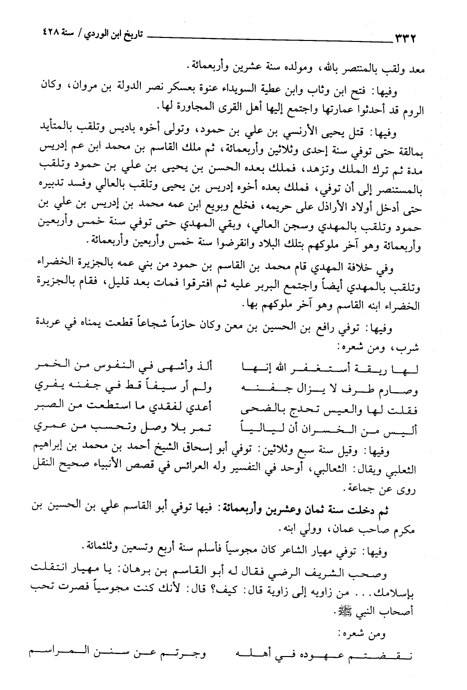 وفيهَا: قتل يحيى الأرنسي بن عَليّ بن حمود، وَتَوَلَّى أَخُوهُ باديس وتلقب بالمتأيد بمالقه حَتَّى توفّي سنة إِحْدَى وَثَلَاثِينَ وَأَرْبَعمِائَة، ثمَّ ملك الْقَاسِم بن مُحَمَّد ابْن عَم إِدْرِيس مُدَّة ثمَّ ترك الْملك وتزهد، فَملك بعده الْحسن بن يحيى بن عَليّ بن حمود وتلقب بالمستنصر إِلَى ان توفّي، فَملك بعده أَخُوهُ إِدْرِيس بن يحيى وتلقب بالعالي وَفَسَد تَدْبيره حَتَّى أَدخل أَوْلَاد الأراذل على حريمه، فَخلع وبويع ابْن عَمه مُحَمَّد بن إِدْرِيس بن عَليّ بن حمود وتلقب بالمهدي وسجن العالي، وَبَقِي الْمهْدي حَتَّى توفّي سنة خمس وَأَرْبَعين وَأَرْبَعمِائَة وَهُوَ آخر مُلُوكهمْ بِتِلْكَ الْبِلَاد وانقرضوا سنة خمس وَأَرْبَعين وَأَرْبَعمِائَة.