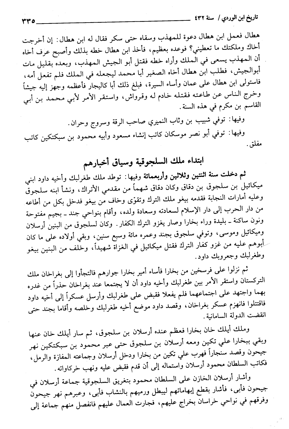 ثمَّ دخلت سنة اثْنَتَيْنِ وَثَلَاثِينَ وَأَرْبَعمِائَة وفيهَا: توطد ملك طغرلبك وأخيه دَاوُد ابْني مِيكَائِيل بن سلجوق بن دقاق وَكَانَ دقاق شهما من مقدمي الأتراك، وَنَشَأ ابْنه سلجوق وَعَلِيهِ أَمَارَات النجابة فقدمه بيغو ملك التّرْك وتقوى وَخَافَ من بيغو فَدخل بِكُل من أطاعه من دَار الْحَرْب إِلَى دَار الْإِسْلَام لسعادته وسعادة وَلَده، وَأقَام بنواحي جند - بجيم مَفْتُوحَة وَنون سَاكِنة - بليدَة وَرَاء بخارا وَصَارَ يَغْزُو التّرْك الْكفَّار. وَكَانَ لسلجوق من الْبَنِينَ أرسلان وَمِيكَائِيل ومُوسَى، وَتُوفِّي سلجوق بجند وعمره مائَة وَسبع سِنِين، وَبَقِي أَوْلَاده على مَا كَانَ أبوهم عَلَيْهِ من غَزْو كفار التّرْك فَقتل مِيكَائِيل فِي الْغُزَاة شَهِيدا، وَخلف من الْبَنِينَ بيغو وطغرلبك وجعروبك دَاوُد.