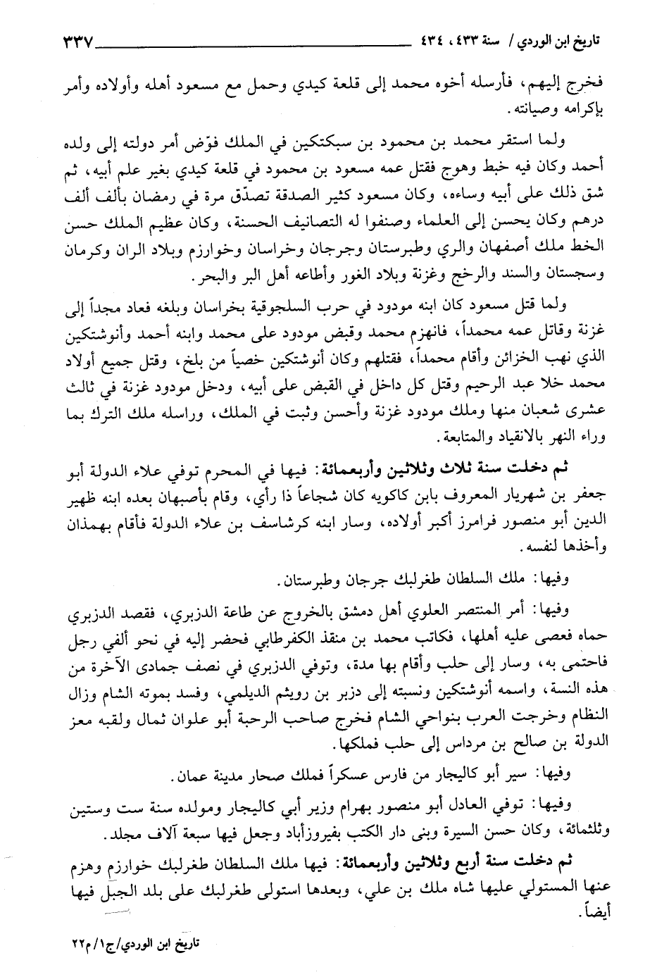 ثمَّ دخلت سنة أَربع وَثَلَاثِينَ وَأَرْبَعمِائَة: فِيهَا ملك السُّلْطَان طغرلبك خوارزم وَهزمَ عَنْهَا المستولي عَلَيْهَا شاه ملك بن عَليّ، وَبعدهَا استولى طغرلبك على بلد الْجَبَل فِيهَا أَيْضا.
